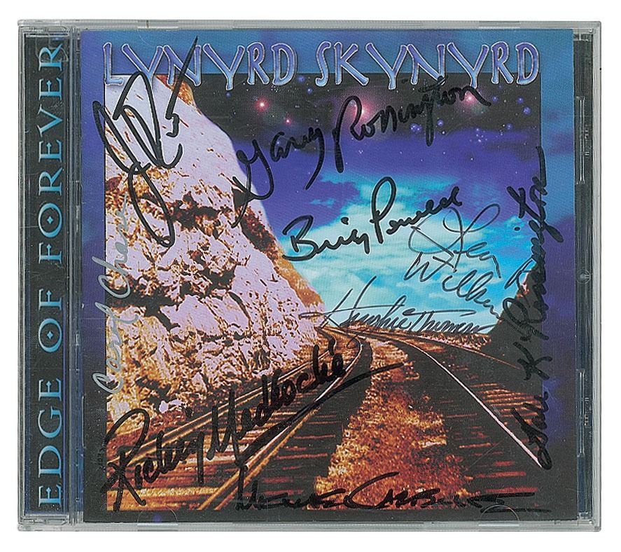 Edge of Forever CD by Lynyrd Skynyrd, signed on the front of the booklet in various ink types by Johnny Van Zant, Gary Rossington, Billy Powell, Leon Wilkeson, Rickey Medlocke, Hughie Thomasson, Dale Krantz-Rossington, Carol Chase, and Michael Cartellone. In fine condition, with adhesive remnants to back side of jewel case. The CD is included.