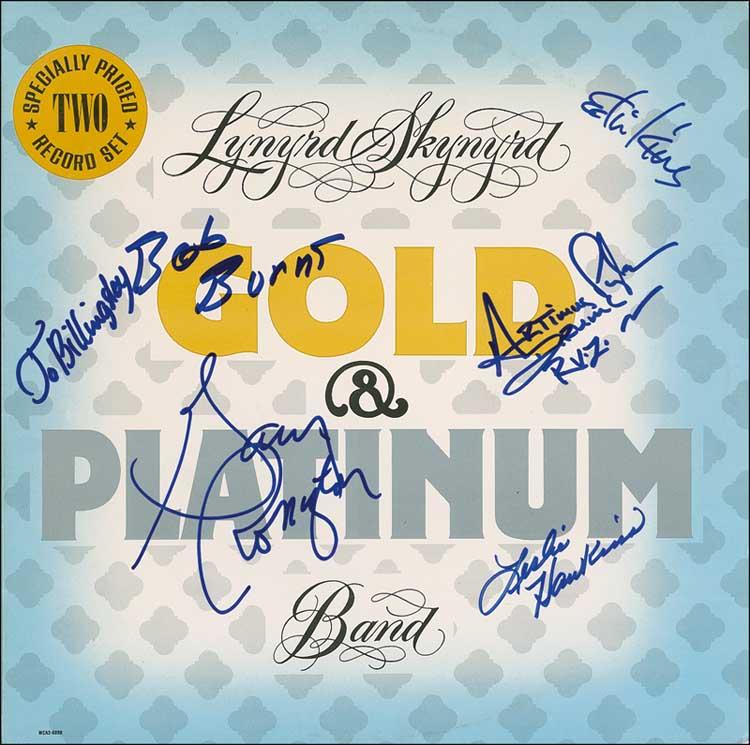 Gold and Platinum album signed on the front cover in blue felt tip by Gary Rossington, Artimus Pyle, Bob Burns, Jo Billingsley, Leslie Hawkins, and Ed King. In fine condition, with a light ‘ring of wear’ on back cover. The record is included. RRAuction COA.