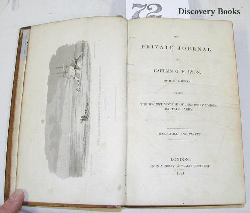 Lyon, Capt. G. F. THE PRIVATE JOURNAL OF CAPT. G. F. LYON, OF H.M.S. HECLA, DURING THE RECENT VOYAGE OF DISCOVERY UNDER CAPTAIN PARRY. London: John Murray 1824 xii,468pp. Seven plates, folded map. Old full calf, emblem of The Society of Writers to the Signet on front & back,. Rubbed & worn, spine flaking. title a bit marked & lightly soiled. Good
