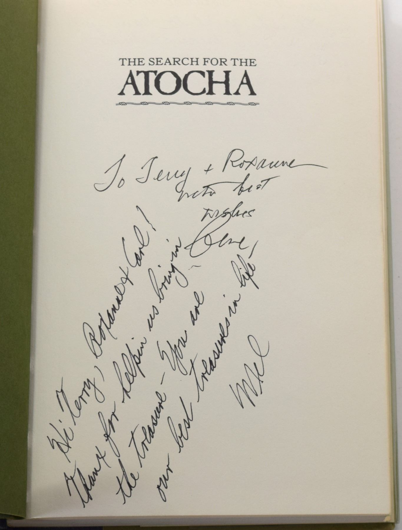 Lyon, Eugene. (Signed) THE SEARCH FOR THE ATOCHA. Harper & Row, Publishers. 1979. 12mo, 246 pages; Hardcover w/ DJ; Separately inscribed and signed by the author, Eugene Lyons, and Mel and Deo Fisher; This book is the story of how good archival research located and identified the sunken Spanish galleon, 'Atocha', which Mel Fisher salvaged off the Florida Keys in the 1970s and 80s. The author was the researcher who found the 'key' to locating the 'Atocha' wreck site in the archives in Seville, Spain.after Mel had spent 10 years searching the entire length of the Florida Keys without success. Subject: History - Sunken Treasure
