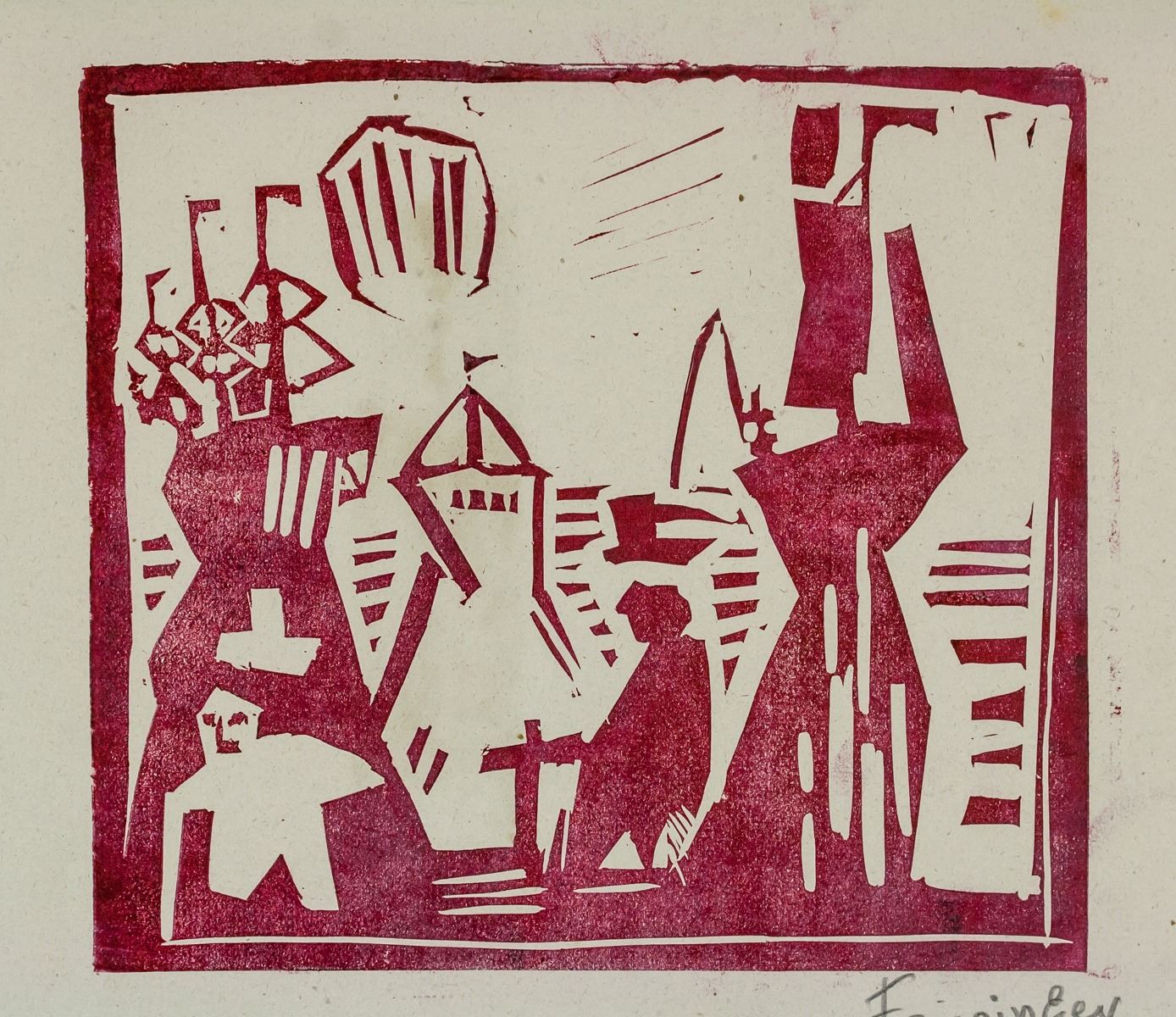 Woodcut on paper. Featuring a composition scene. Signed Feininger in pencil on the lower right corner. Stamped illegibly on verso. Attributed to Lyonel Feininger (1871-1956, German). 16 x 22 cm (6.25 x 8.5 inches)