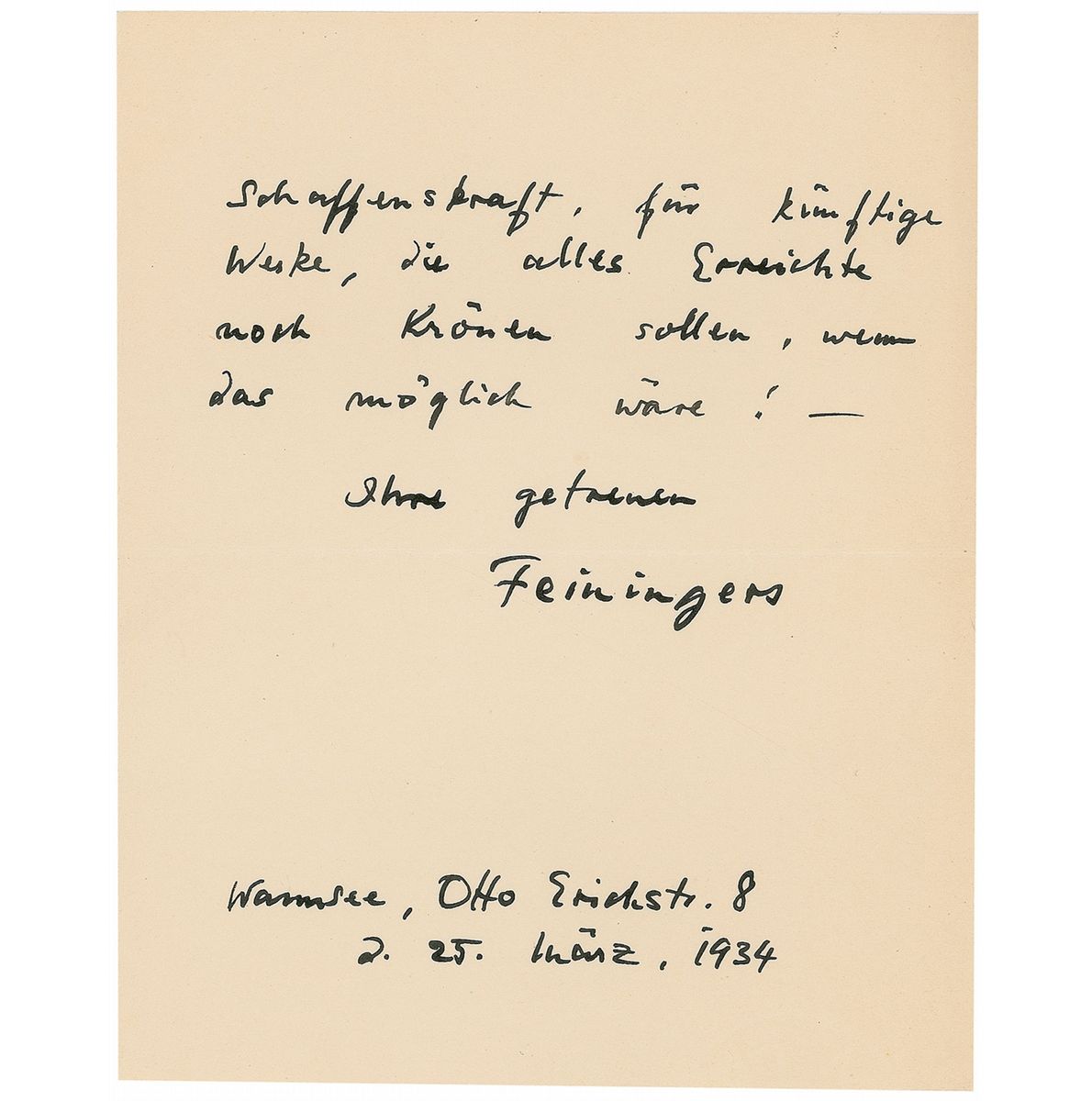 German-American painter and a leading exponent of Expressionism (1871–1956). Boldly penned ALS in German, signed “Feininger,” two pages on two adjoining sheets, 6 x 7.5, personal letterhead, March 25, 1934. Letter to fellow painter Alexej von Jawlensky, addressing him as “Dear Blue Brother,” offering congratulations on his 70th birthday. In fine condition. Together with Wassily Kandinsky and Paul Klee, Feininger and Jawlensky formed ‘Die Blaue Vier [The Blue Four]’ in 1923, and between 1925 and 1934 mounted exhibitions of their work in the United States, Mexico, and Germany. An excellent artistic association.
