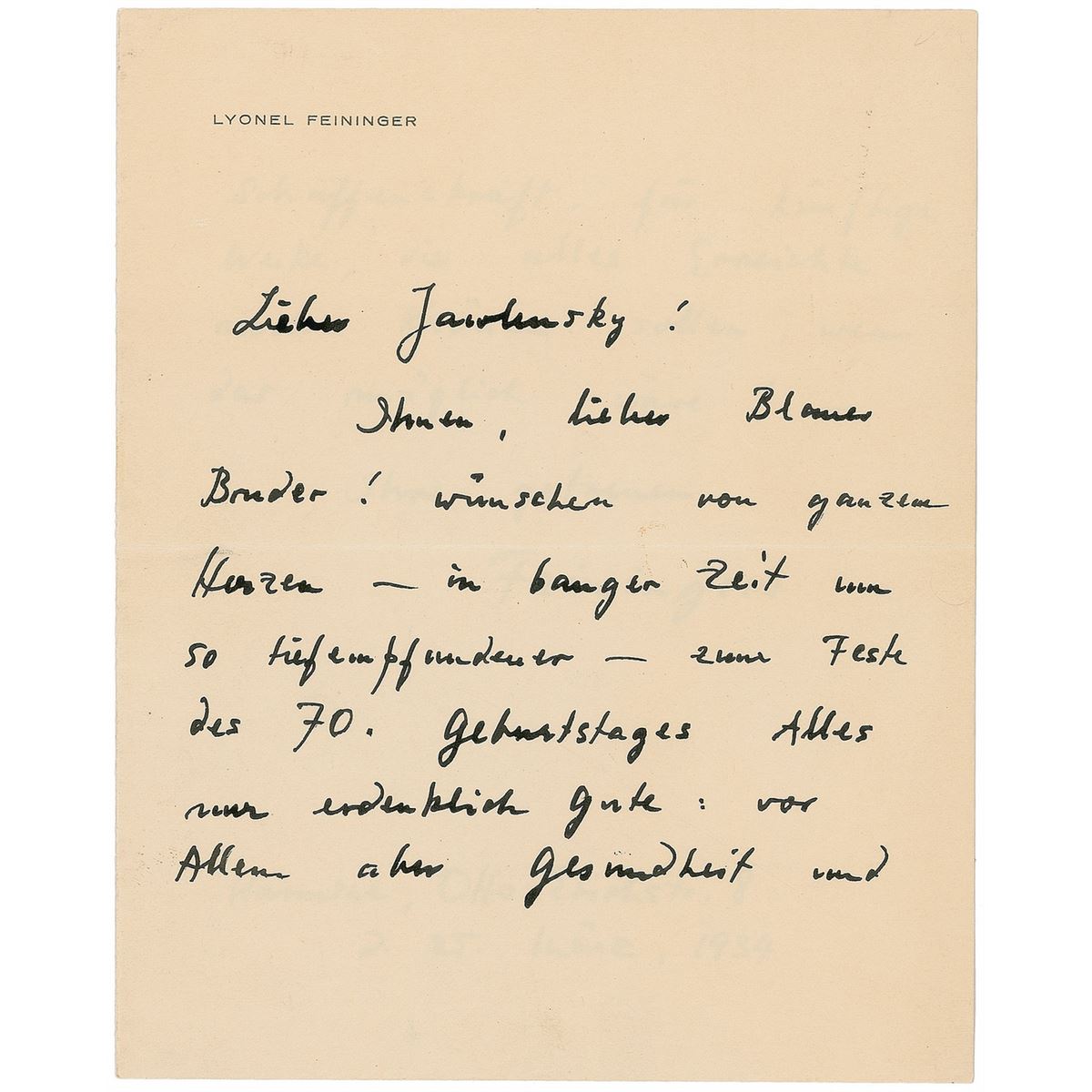 German-American painter and a leading exponent of Expressionism (1871–1956). Boldly penned ALS in German, signed “Feininger,” two pages on two adjoining sheets, 6 x 7.5, personal letterhead, March 25, 1934. Letter to fellow painter Alexej von Jawlensky, addressing him as “Dear Blue Brother,” offering congratulations on his 70th birthday. In fine condition. Together with Wassily Kandinsky and Paul Klee, Feininger and Jawlensky formed ‘Die Blaue Vier [The Blue Four]’ in 1923, and between 1925 and 1934 mounted exhibitions of their work in the United States, Mexico, and Germany. An excellent artistic association.