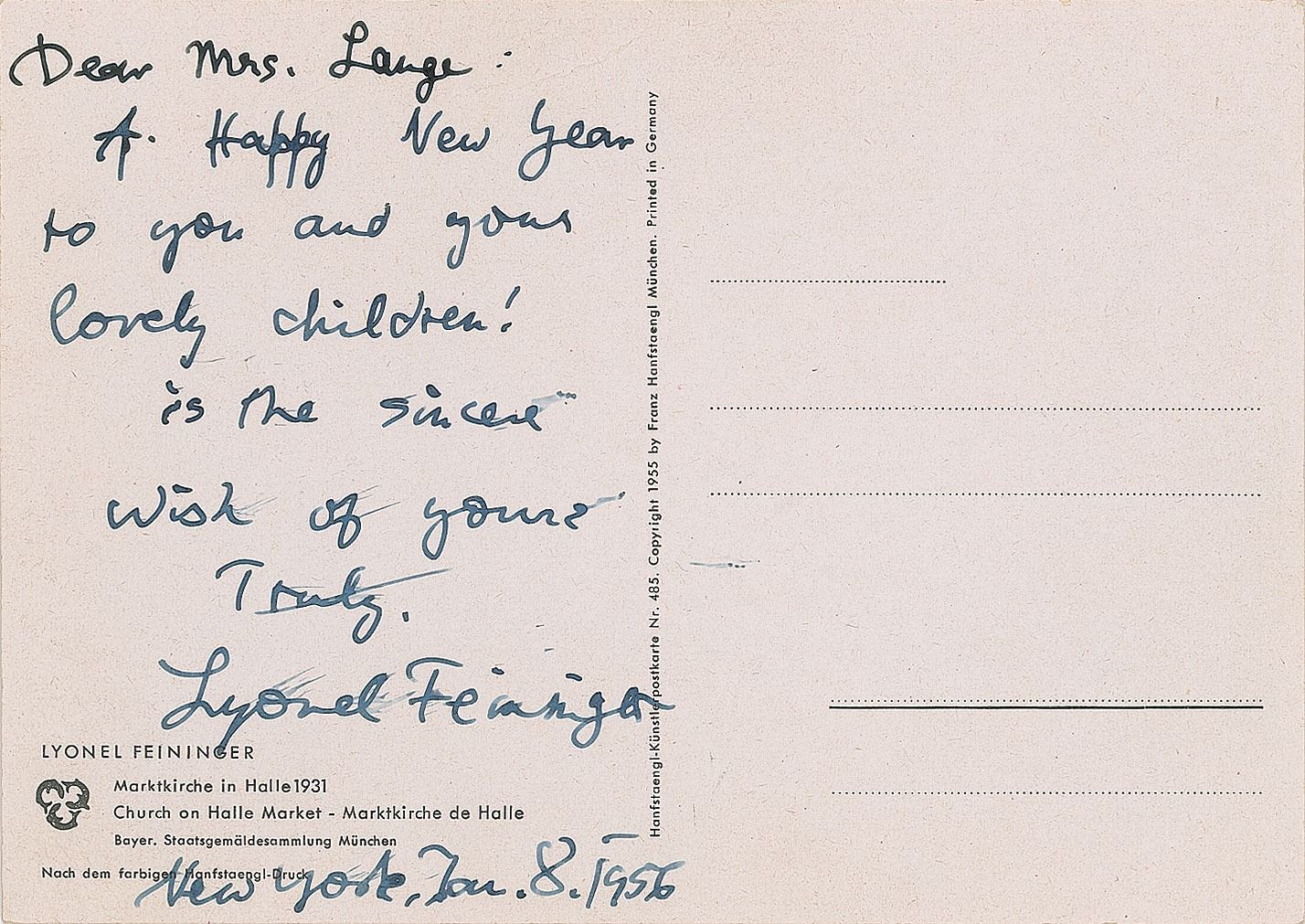 German-American painter and a leading exponent of Expressionism (1871–1956). ALS, one page on a 5.75 x 4.25 postcard depicting one of his paintings, January 8, 1956. Letter to Mrs. Lange, in full: "A Happy New Year to you and your lovely children! is the sincere wish of yours truly." In fine condition, with slight brushing to the signature.