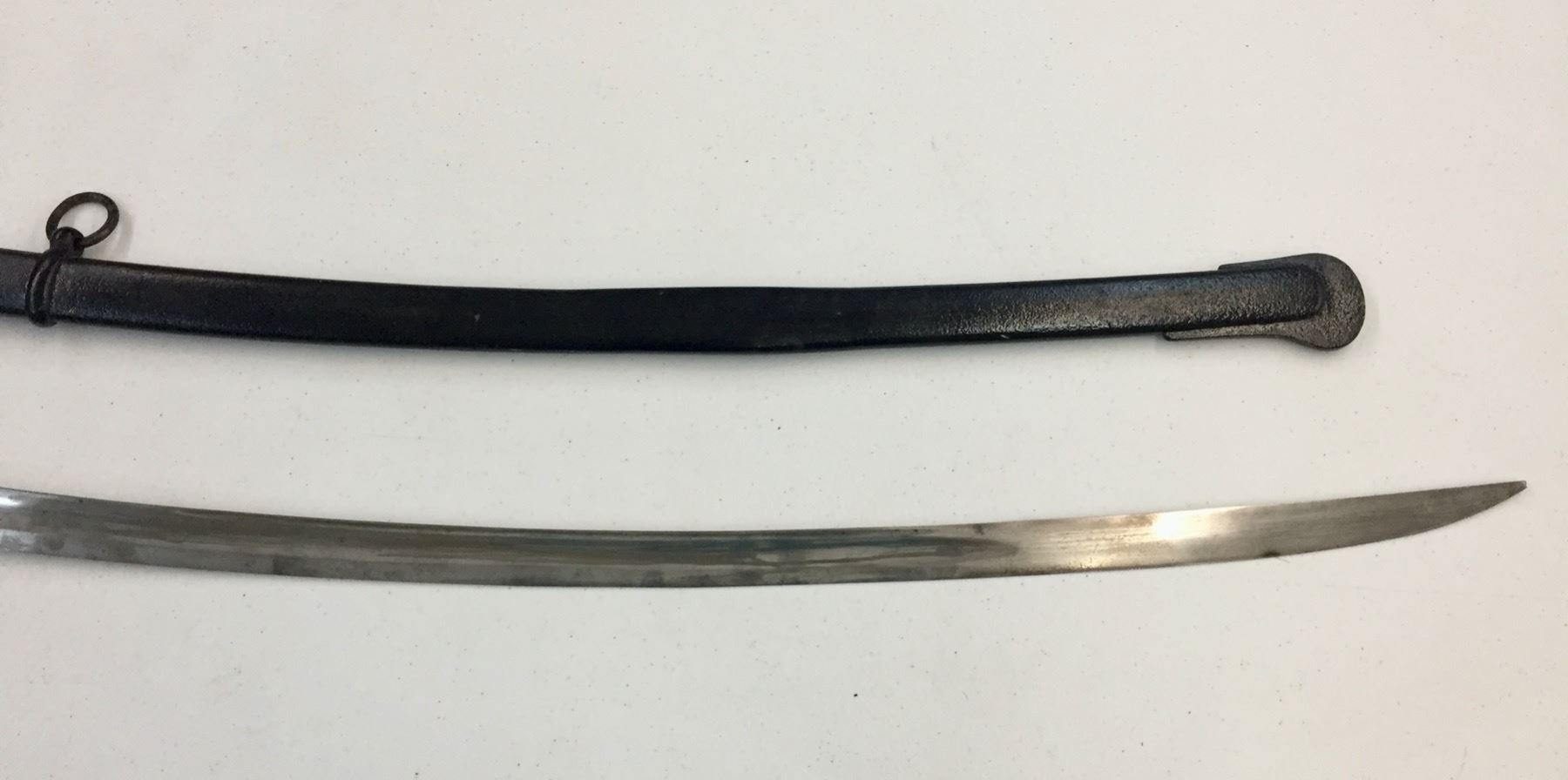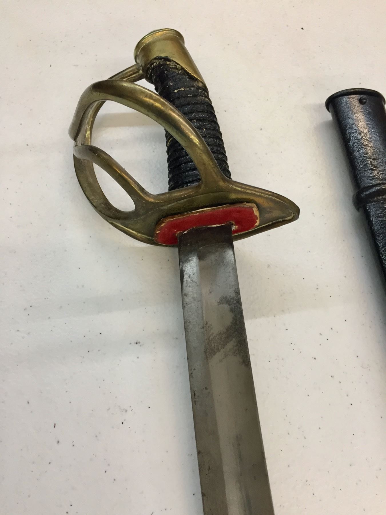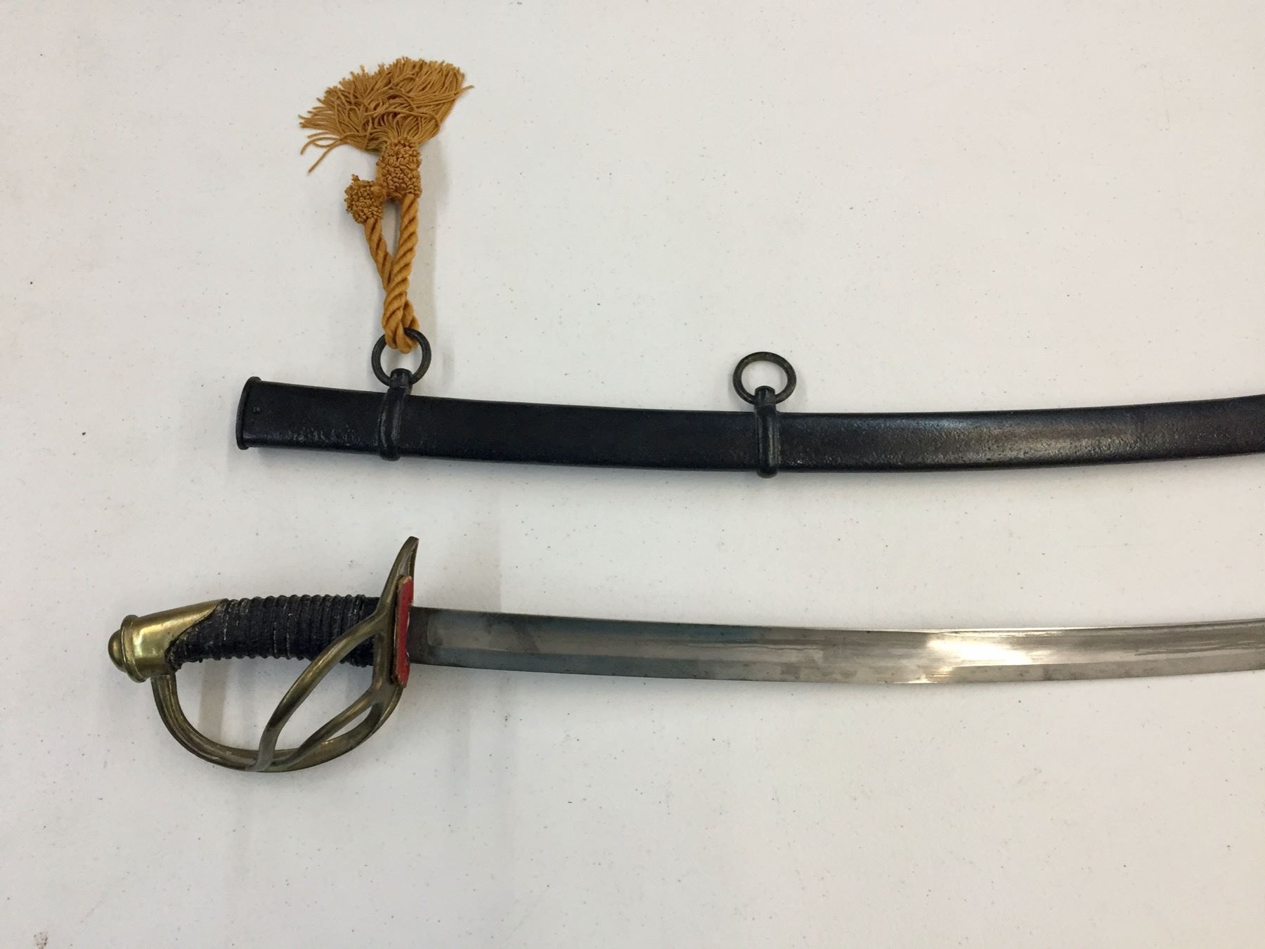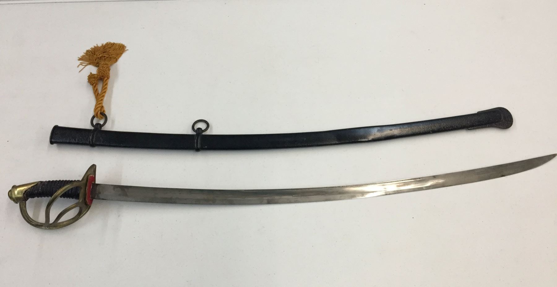 Description: Presented for sale in this lot is a sword in the style of the Model 1860 Cavalry sword. It has a metal sheath which has been painted black. The handle has also been replaced. No markings on the hilt. Maker: Unknown. Approx. Age: Vintage. Size: Measures 42-1/2†long. Condition: Fair, has been altered as described above. Please look closely at the pictures - they are an important part of our description. Shipping: There will be a $10 handling / packaging fee for shipping this lot. The actual cost of postage will be added on top of that.