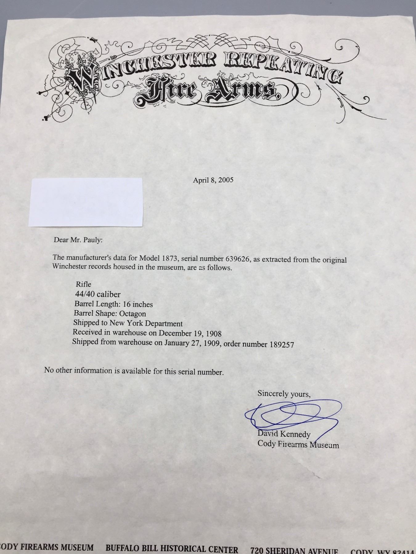 Description: For your consideration we offer this Winchester Model 1873 short rifle in a .44/40 caliber. Includes a letter of authenticity.