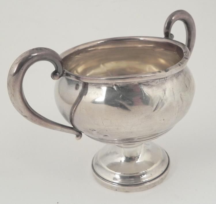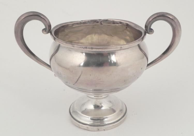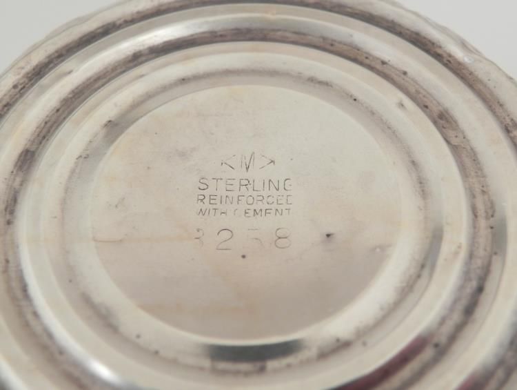 This is a small compote or handled dish with elegant pedestal and decorative rim. It is weighted, with a weight of 3.2 ounches. The dimensions of the dish are 5 1/2 x 3 1/4 inches. It is dented, and most suitable for scrap. The underside of the base is marked with M and number.