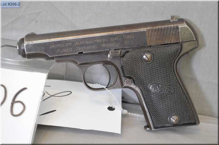 M.A.B. Mod C .7.65 MM cal 7 shot semi automatic Pistol w/ 83 mm bbl [ fading blue finish, checkered M.A.B. grips ] Ser # SG 411 12-6 Prohib Cert # 6157604