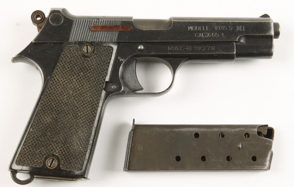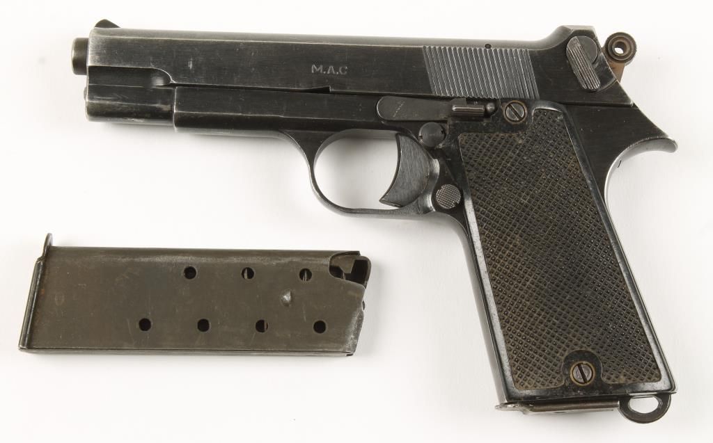 French military single action semi auto pistol with 4.3" barrel. Used by the French Foreign Legion. Blued finish, checkered black plastic grips, hammer block safety and fixed sights. Good bore and action. Includes 2 magazines. Condition: Fair to good overall showing thinning bluing , high point wear and light scratching. *Curio and Relic Firearm*