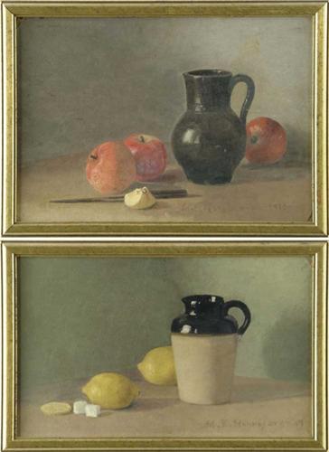 M.A. HANNAFORD (Early 20th Century) TWO TABLE TOP STILL LIFES. Oil on board, both housed in identical gilt molded wood frames. One shows stoneware brown top pitcher with lemons and sugar cubes. The other shows brown stoneware pitcher with apples and knife. Signed "M.E. Hannaford 1910" and "09". SIGHT SIZE: 12-1/2" x 18" and 11" x 18". CONDITION: Generally good. 9-28016