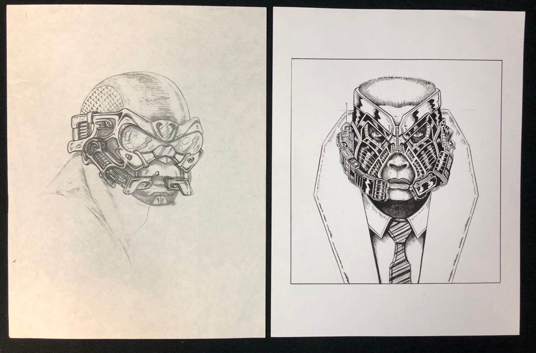 Set of 2 production used concept artwork prints made for the production of the science fiction television series " M.A.N.T.I.S." (1994) created by Sam Raimi, the exciting superhero TV show about a scientist who builds a powerful exo-skeleton in order to walk again, and uses his new abilities to fight crime. M.A.N.T.I.S. is an American science fiction television series that aired for one season on the Fox Network between August 26, 1994 and March 3, 1995. The original two-hour pilot was produced by Sam Raimi and developed by Sam Hamm.