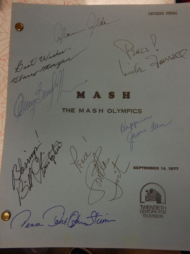 Original script for the episode The Mash Olympics from the series M*A*S*H signed by Alan Alda, Harry Morgan, Mike Farrell, Gary Burkhoff, William Christopher, Jamie Farr, Loretta Swit, and David Ogden Stiers. All items come with a certificate of authenticity good for the life of the piece.