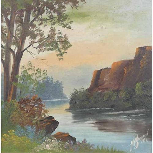 M. A. Sundown, Oil on Board, Landscape at Sunset, 11" x 11 1/2", Signed lower right.
