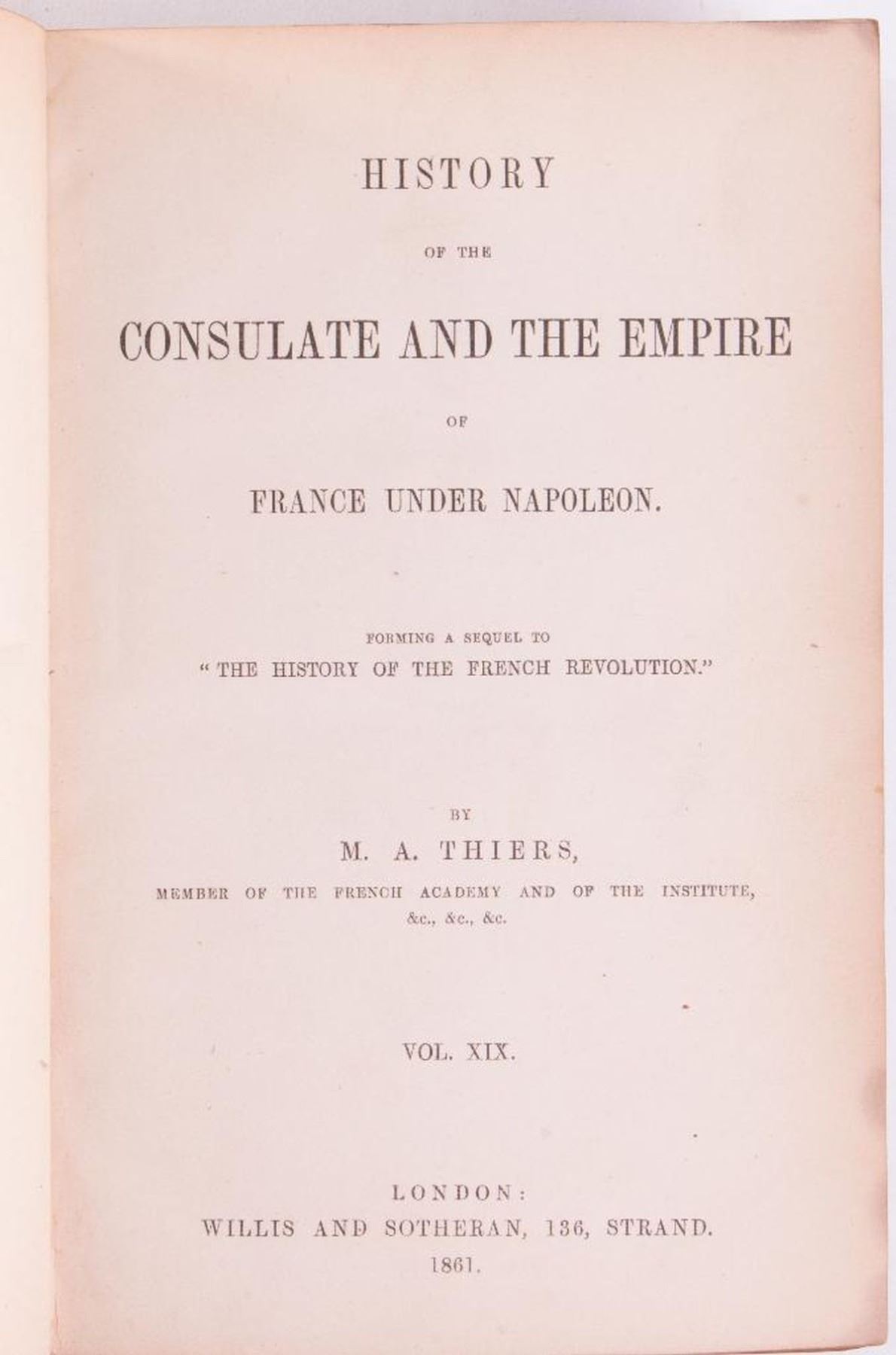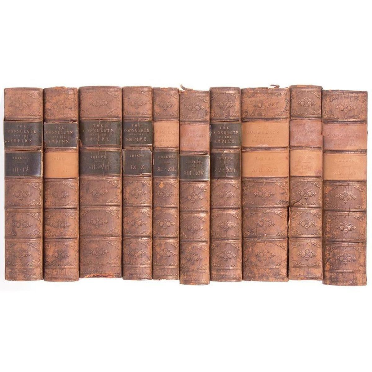 Title: History of the Consulate and the Empire of France Under the Napoleon Author: M.A. Thiers Place: London Publisher: Henry Colburn; Willis and Sotheran Date: Various dates: 1845, 1861... Description: Ten volume set. Ten volumes in three quarter binding, brown leather and marbled boards. Various dates and publishers. Condition: Good condition. Leather shows signs of wear: bumping, rubbing, chipping. Leather title blocks are missing.