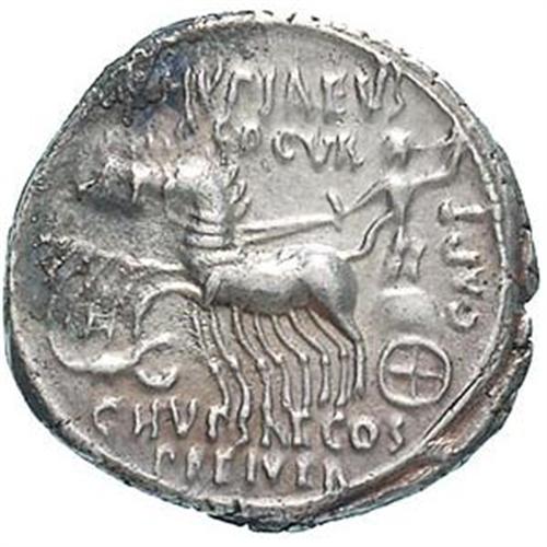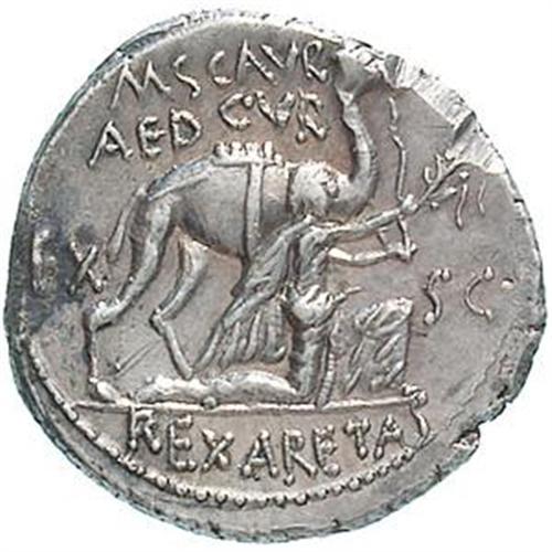 Repubblica Romana. M. Aemilius Scaurus e Pub. Plautius Hypsaeus. Denarius, 58 a.C. D/ M. SCAVR AED CVR EX SC. Il re Aretas inginocchiato a destra, accanto al proprio cammello. In esego: REX ARETAS. R/ Jupiter in quadriga a sinistra. Sopra, P. HYPSAEVS / AED CVR. A destra, CAPT. In esergo: C. HYPSAE COS / PREIVER. A sinistra, scorpione. Cr. 422/1. B. 8. gr. 3.88 AG. Minima ossidazione marginale in ore 9-11 del R/, altrimenti SPL.