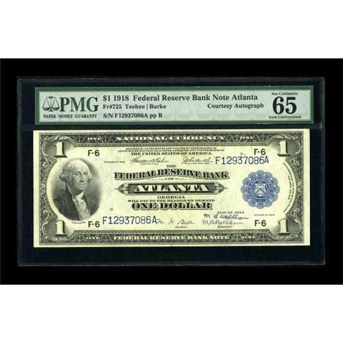 <B>M.B. Welborn Courtesy Autograph Fr. 725 $1 1918 Federal Reserve Bank Note PMG Gem Uncirculated 65 EPQ.</B></I> This is the only note listed in the census for this Friedberg number that has an autographed signature.<BR><BR><b>Shipping:</b> Coins & Currency (<a target="_blank" href="http://www.heritageauctions.com/common/shipping.php">view shipping information</a>)