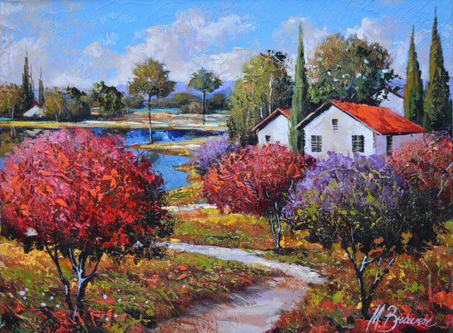M. BRAVER SERENE VIEW SIGNED ORIGINAL ACRYLIC. Artist: Mark Braver (b. 1958) - Title: Serene View - Medium: Acrylic on Canvas - Signature: This one-of-a-kind work is hand-signed by the artist at the bottom of the image - Image Size: Approximately 11.75 inches x 15.75 inches - Framed: Unframed on Unstretched - Note: Was previously stretched - Details: This work comes with a Certificate of Authenticity - Biography: Braver was born in Riga, the capital of Latvia in 1958. Like many young artists of his time, he spent three years in a 'School of Fine Art', but had to discontinue his artistic persuasion when he was drafted to the Red Army. Mark Braver's artwork is unique in its vivid colors and special textures. - His compositions come to life on the canvas in an abundance of colors while his unique layering and texturing techniques lend the paintings an unusual quality. Mark's work has caught the attention of many a collector and it may now be found in private collections in the United States, Europe and Israel. - Warranty: Item GUARANTEED to be as described