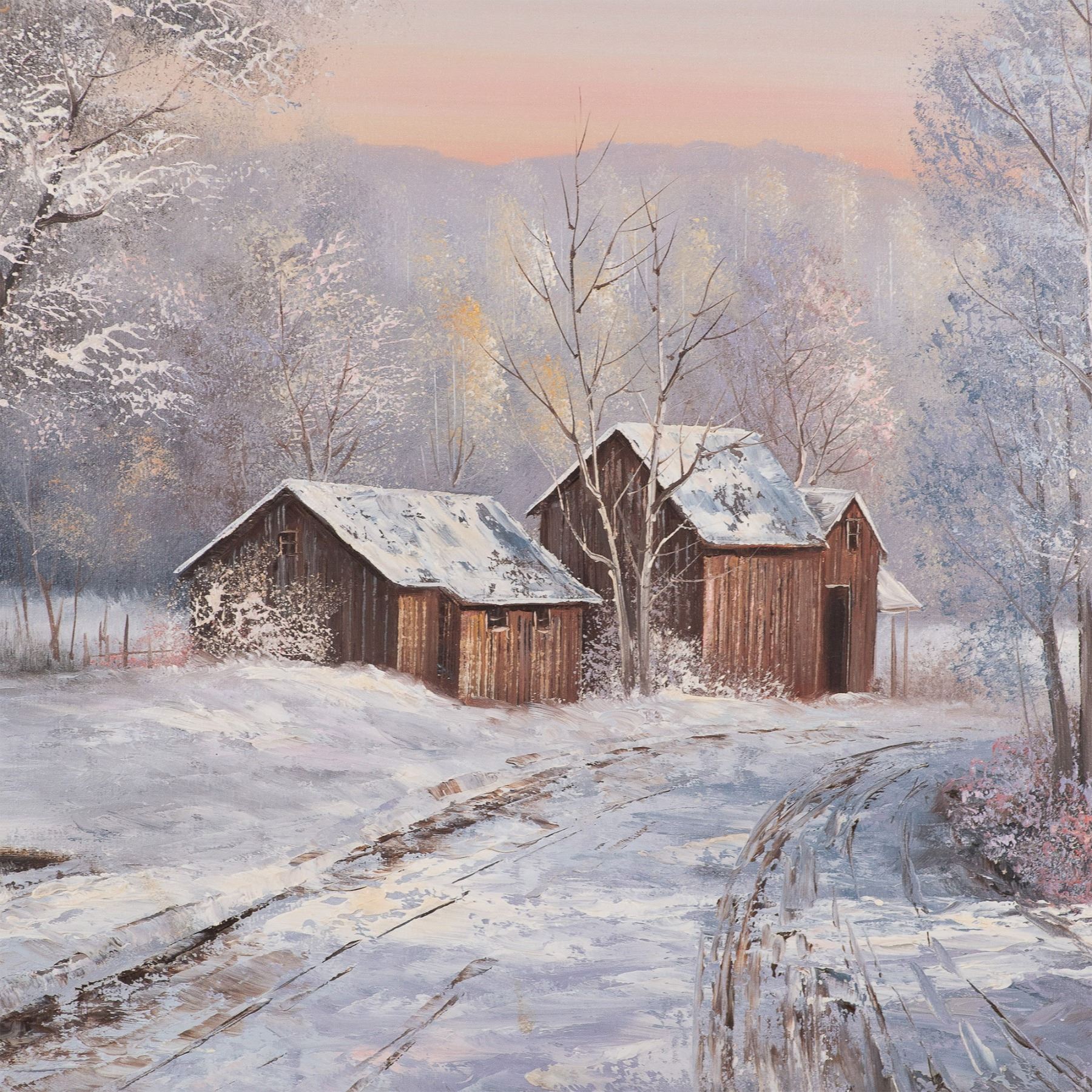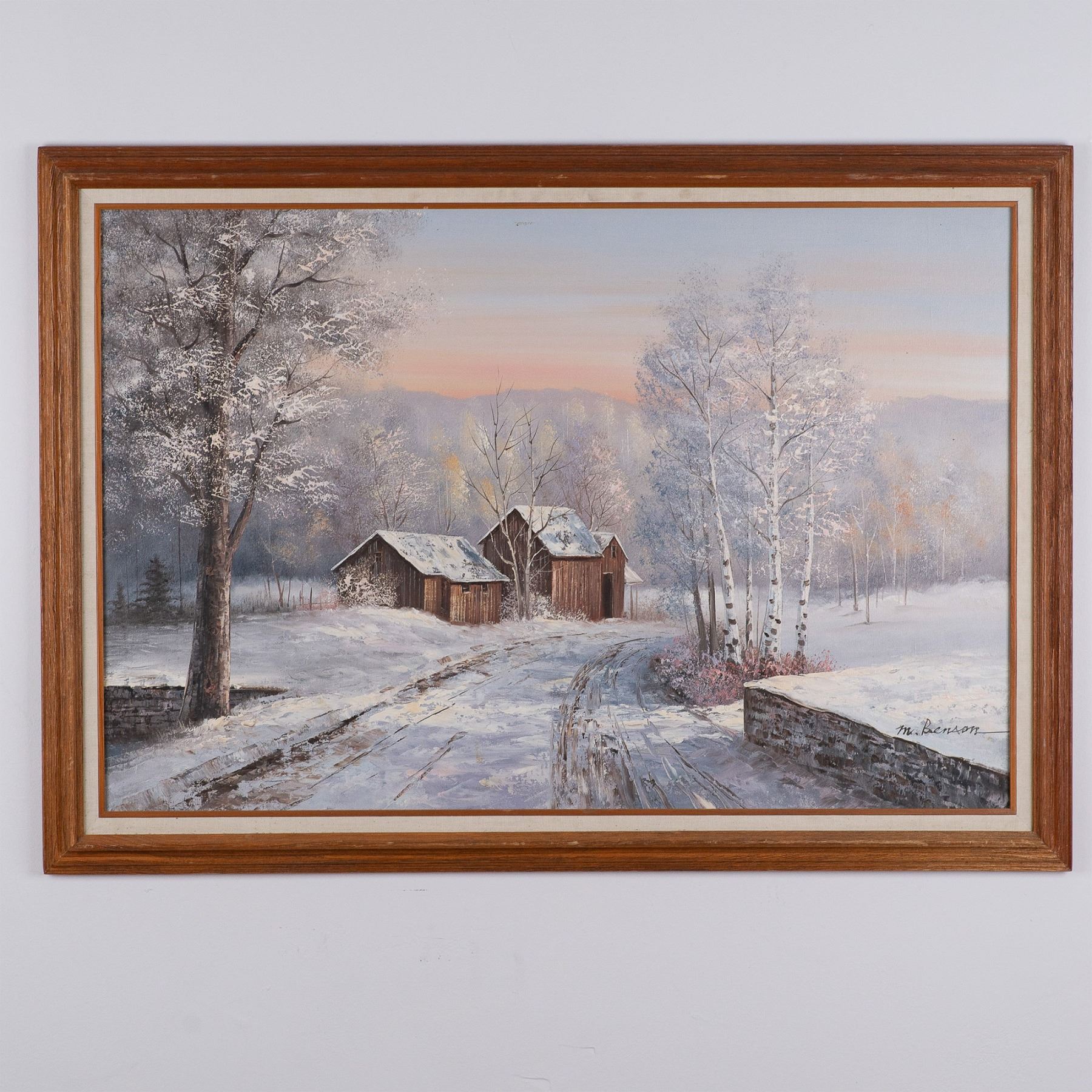 M. Benson, Oil on Canvas, Winter Farmstead Landscape, Signed