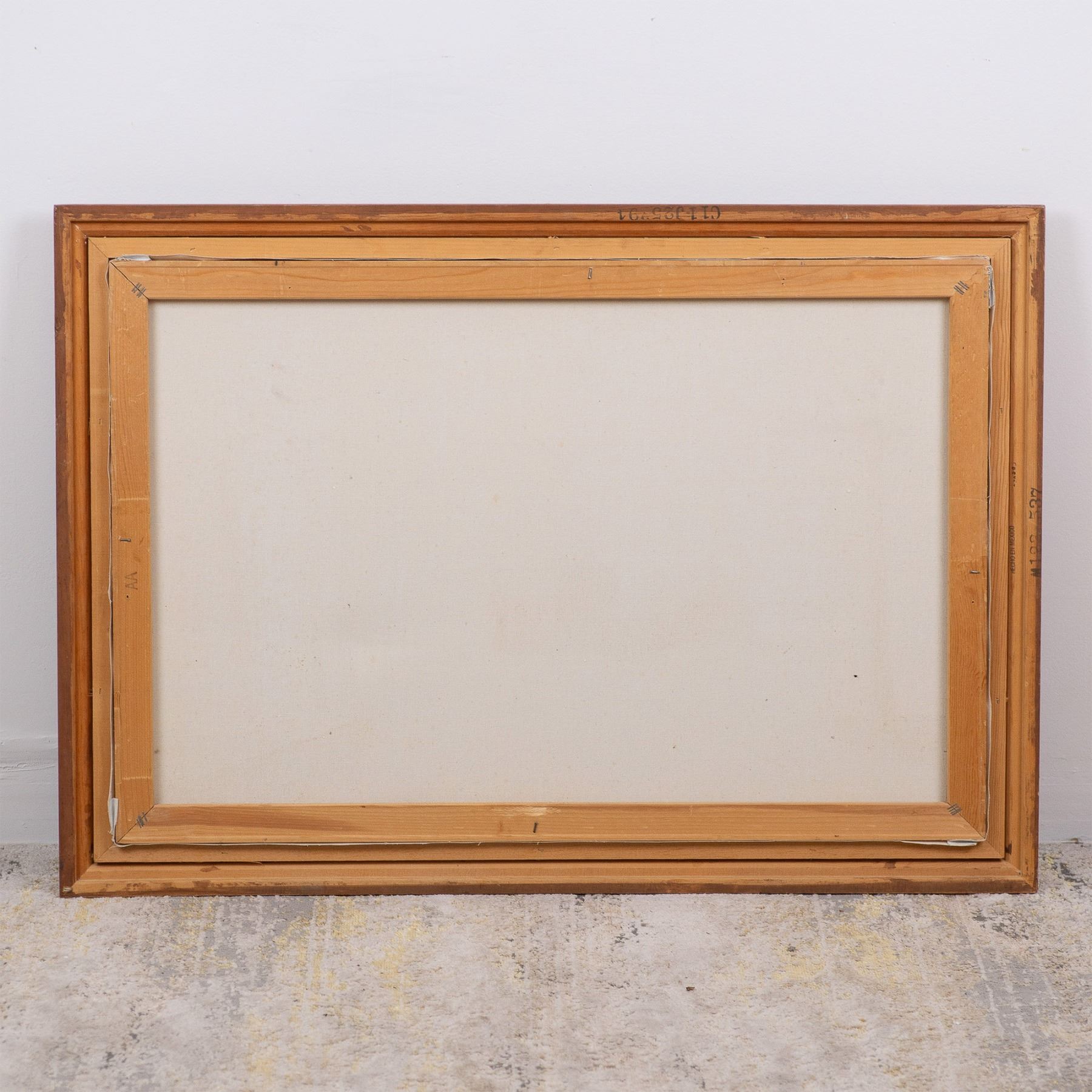 A serene and evocative oil painting by artist M. Benson, depicting a snow-covered rural scene. This picturesque composition features two rustic wooden barns nestled amidst a quiet winter landscape. The winding snow-laden path, bordered by birch trees and a low stone wall, leads the viewer's eye into the tranquil setting. Benson's masterful use of muted tones, combined with subtle touches of color in the twilight sky, captures the stillness and beauty of a winter's day. While little is documented about M. Benson, the work reflects a profound appreciation for rural life and the natural world. The artist's skillful brushwork and attention to detail suggest a dedication to capturing the authentic essence of seasonal landscapes. This painting, with its quiet elegance, stands as a testament to Benson's artistic talent. Housed in a wood frame with a linen border. Artwork dimensions: 35.50"L x 23.50"H. Frame dimensions: 40.75"L x 28.75"H x 2"W.