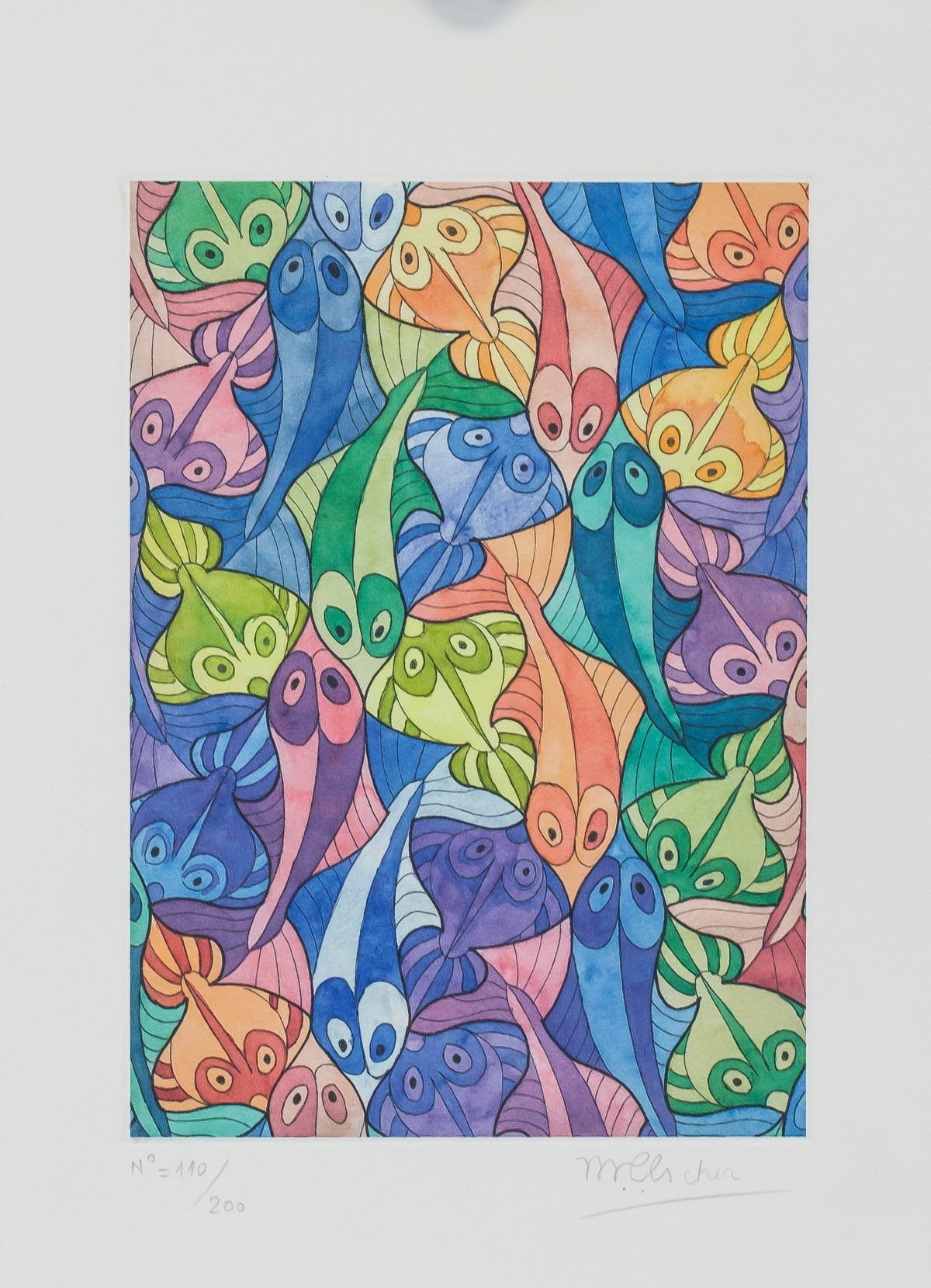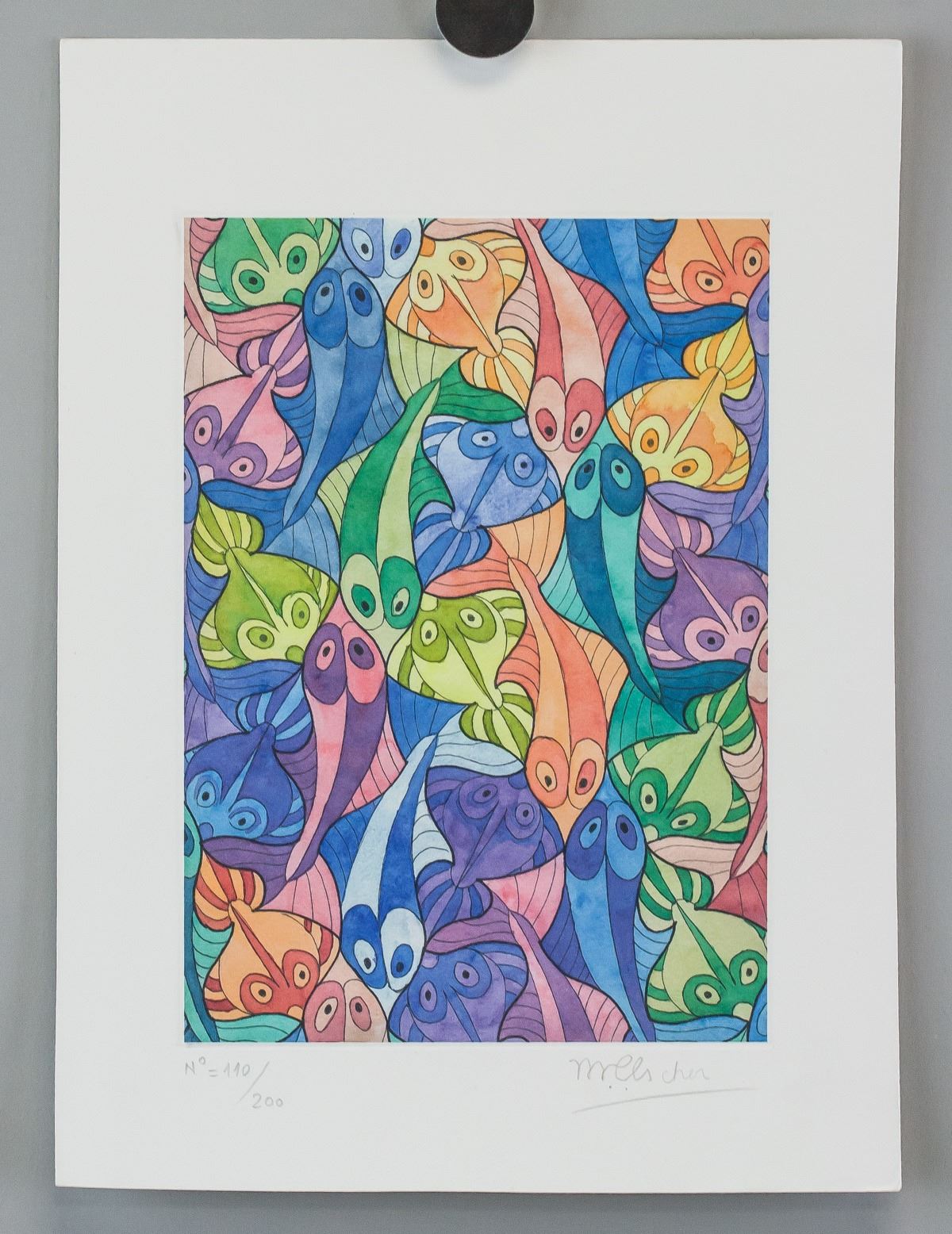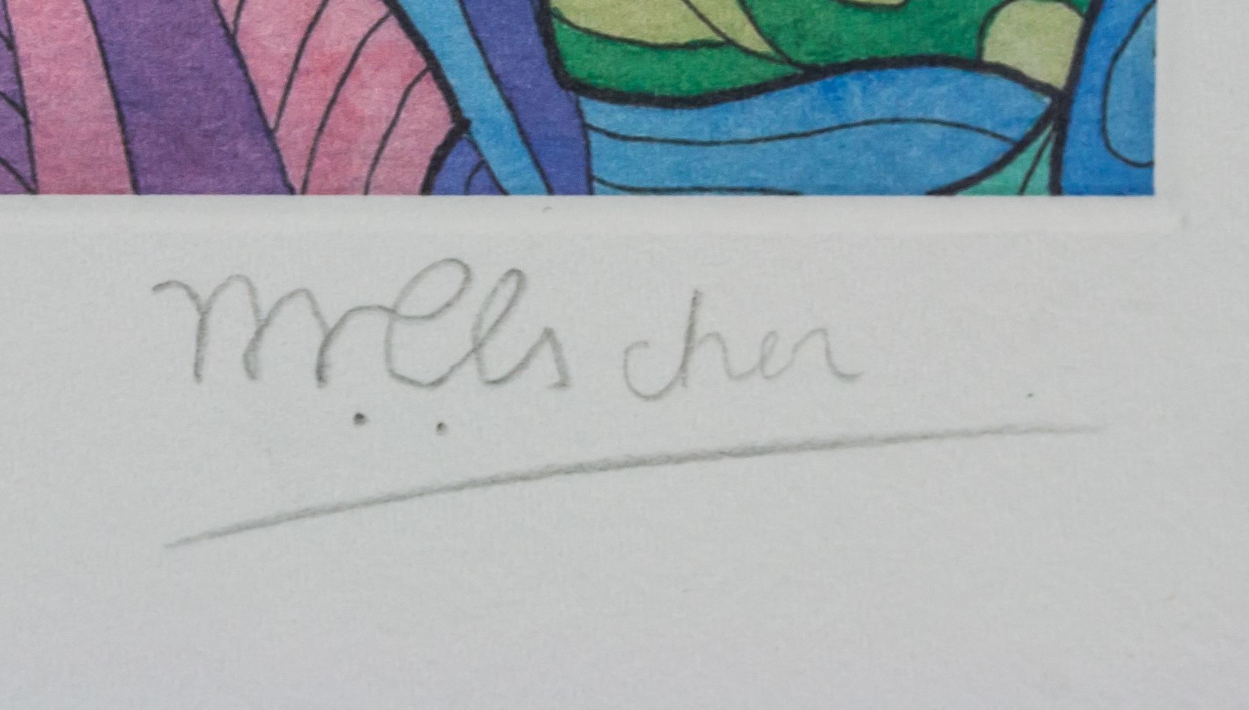 Lithograph on paper. Featuring tessllated, abstract composition. "No = 110/200" inscribed on the bottom left. Signed "MCescher" in the bottom right. Attributed to Maurits Cornelis Escher (1898-1972, Dutch). 29 x 21.5 cm. PROVENANCE: This lot carries limited provenance from an Upper New York estate