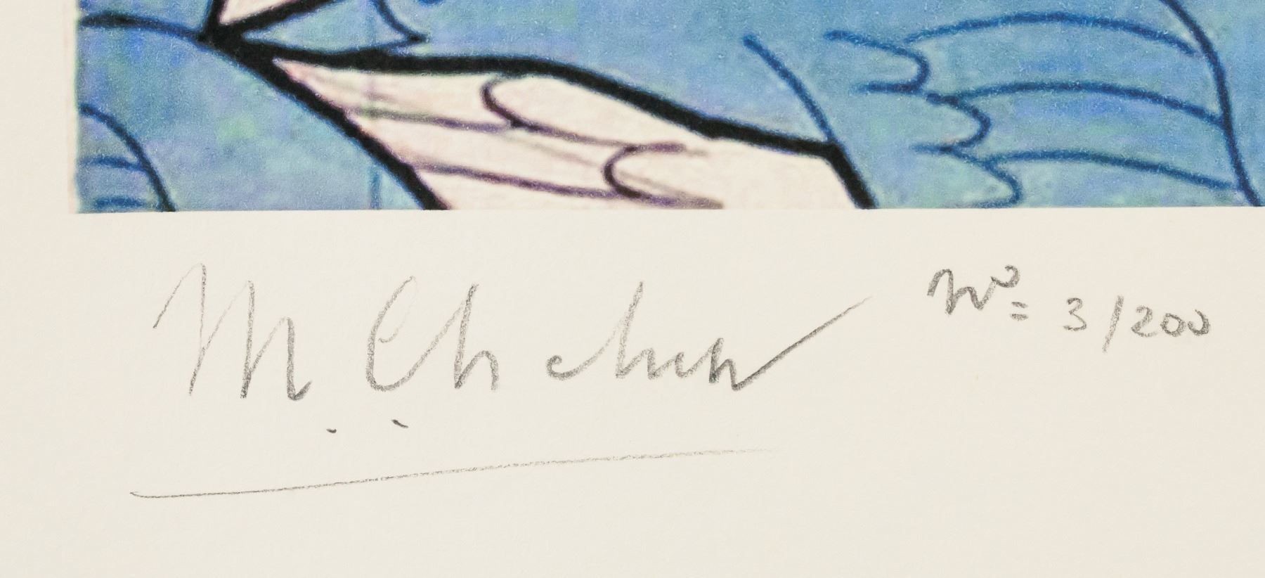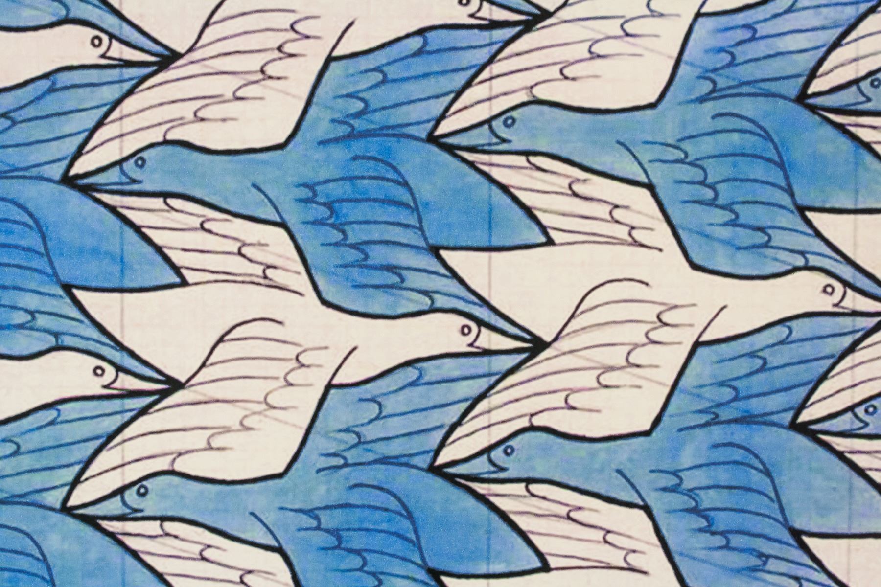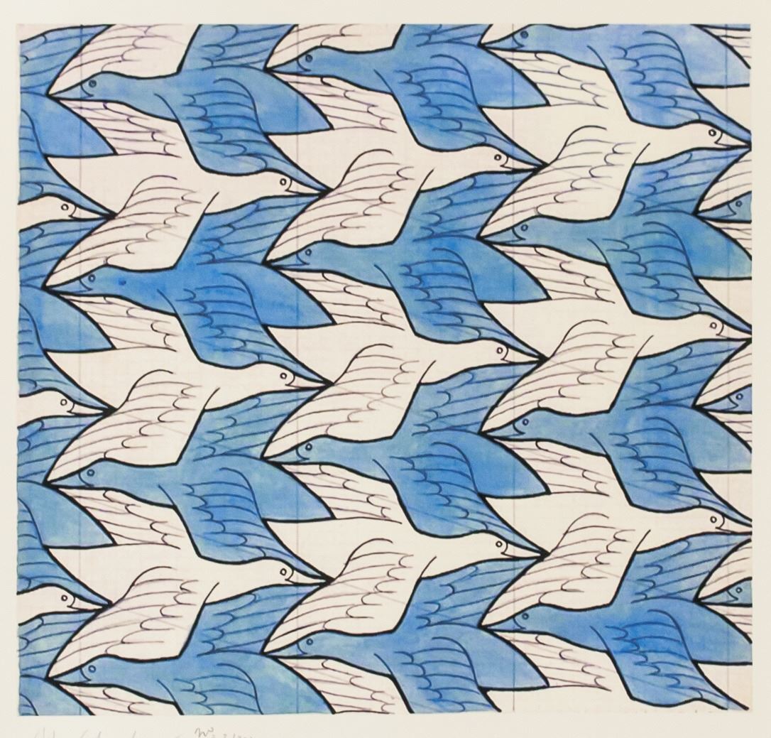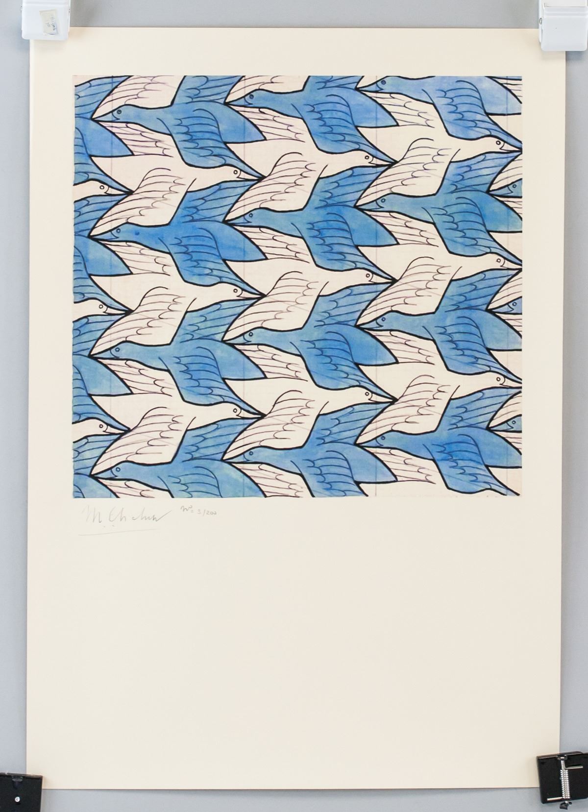 Lithograph on paper. Featuring repeating pattern of birds in blue and yellow. Signed in the bottom left corner. "no=3/200" inscribed in the bottom left corner. Illegible stamp on verso. Attributed to M. C. Escher (1898-1972, Dutch). Image size: 32.5 x 35 cm (12.75 x 13.75 inches). Paper size: 60 x 42 cm (23.5 x 16.5 inches).