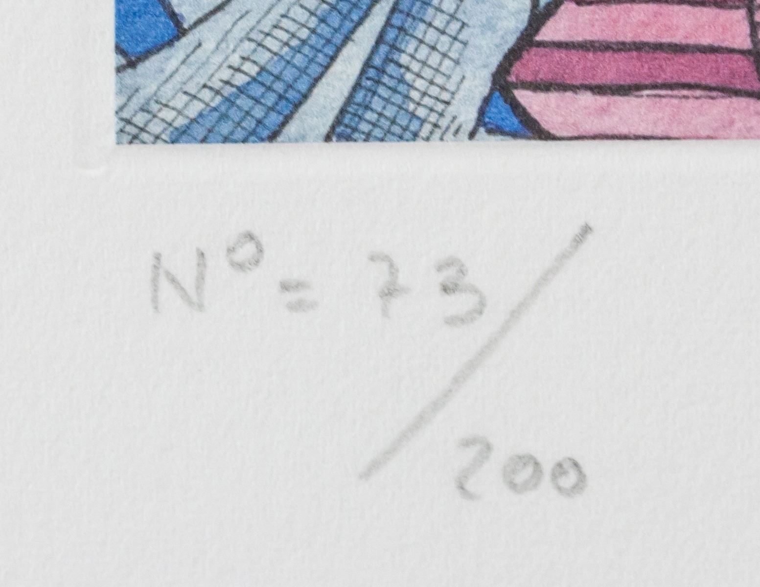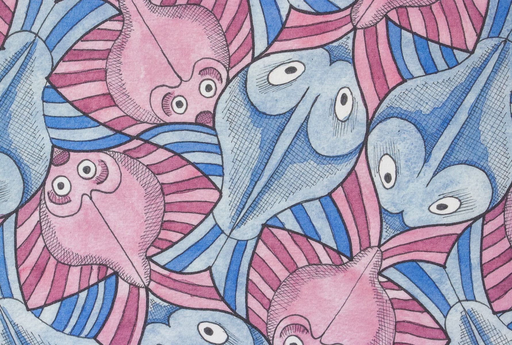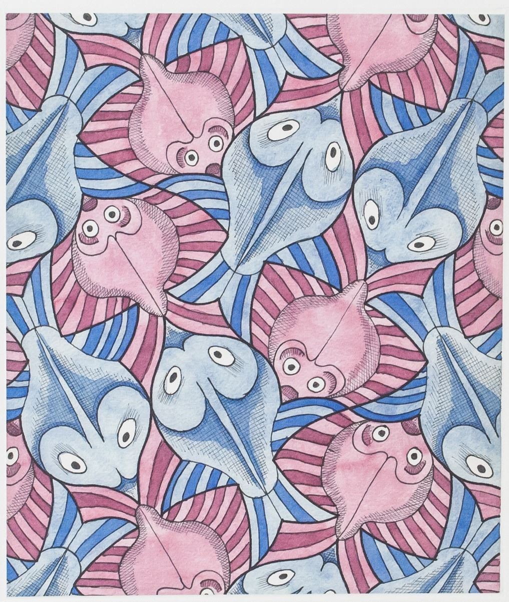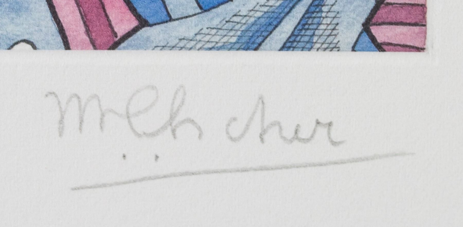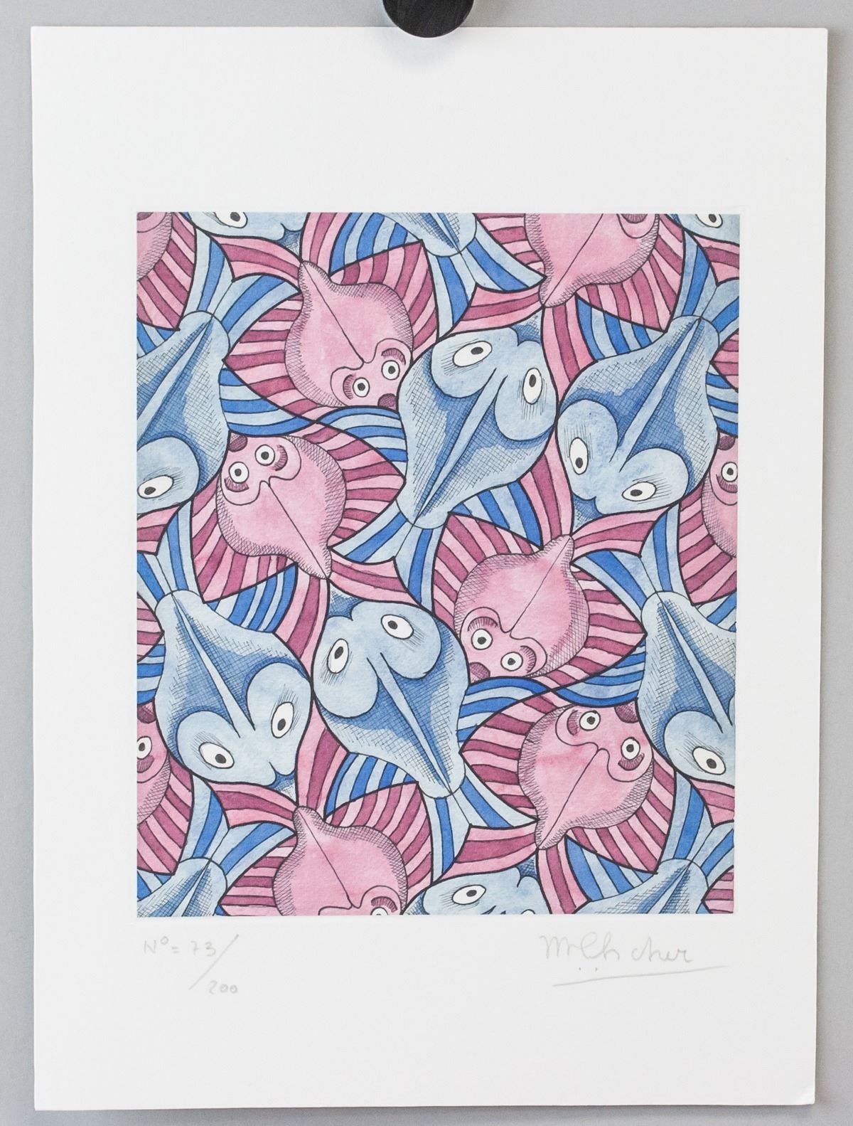Lithograph on paper. Featuring repeating geometric pattern of pink and blue fish. Signed "MEscher" to the bottom right. Numbered "73/200" to the bottom left. Attributed to M. C. Escher (1898-1972, Dutch). Plate: 19 x 16 cm (7.5 x 6.2 in), Sheet: 29 x 21 cm (11.5 x 8.3 in).
