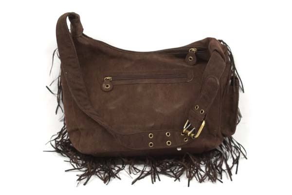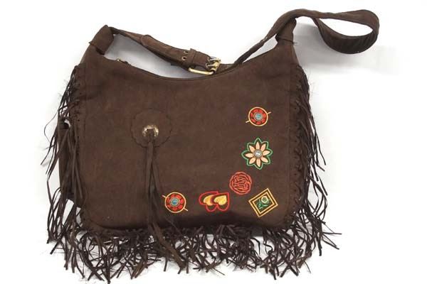 M.C. Marc Chantal Fringed Leather Purse, embellished with buttons and concho and also embroidered flowers, measures 15''W x 10''H (not including fringe)