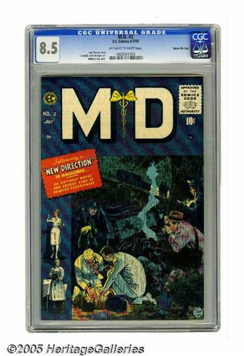 <B>M.D. #2 Gaines File pedigree 1/12 (EC, 1955) CGC VF+ 8.5 Off-white to white pages.</B></I> Johnny Craig cover. Reed Crandall, George Evans, and Graham Ingels art. Overstreet 2005 VF 8.0 value = $68; VF/NM 9.0 value = $99. CGC census 7/05: 2 in 8.5, 2 higher.