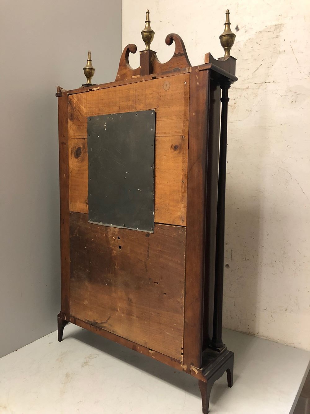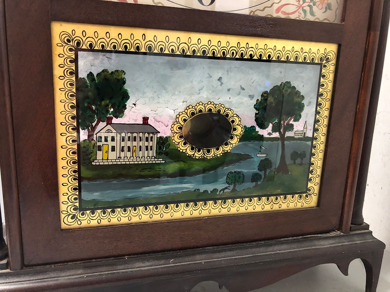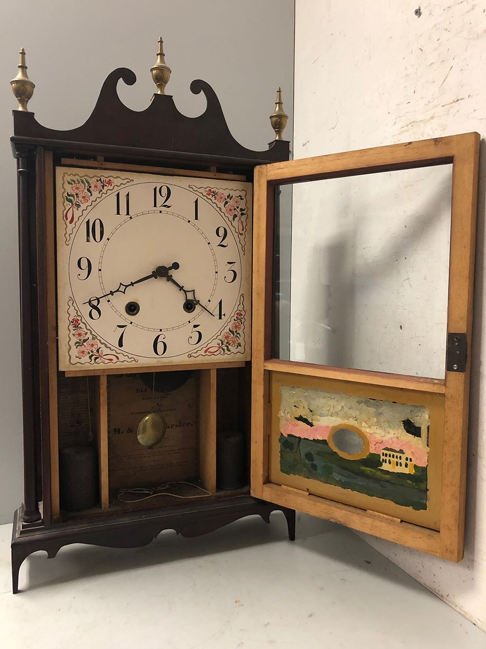 M & E Blakeslee pillar and scroll clock. Unusual beautiful label, Invented by Eli Terry, Made and Sold at Plymouth Connecticut by M & E Blakeslee. Wonderful reverse painted glass, nice finals, dial, wooden works pillar and scroll in working condition. This clock has original reverse painted lower glass, if you had to replace the glass, it would cost approx. $300. This example gives an idea of the value of this clock in all original condition. From the Chatham, Ma, Cape Cod Collection.