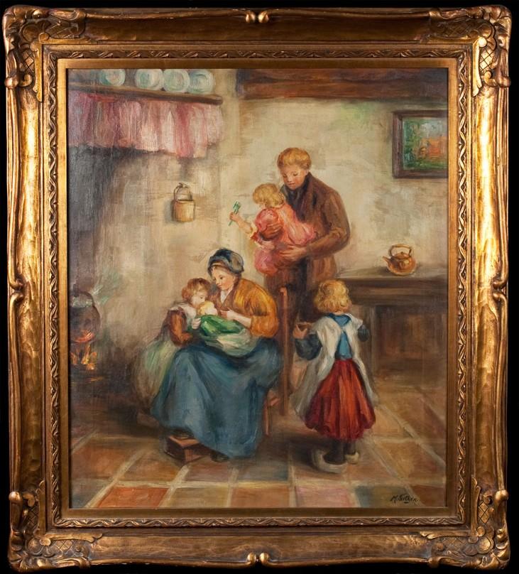 Painted to depict an interior scene with a family, signed lower right M. Fiether ?, very well done, 27.25"H x 23.5"W, sight, 34.75"H x 31"W, framed. Purchased from bloomfield fine arts in the 1990's.