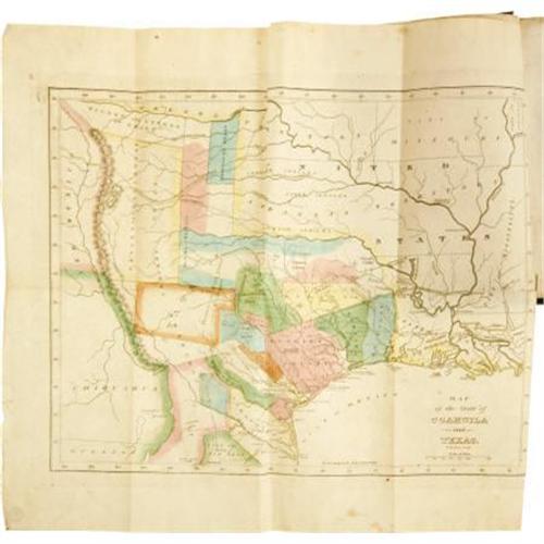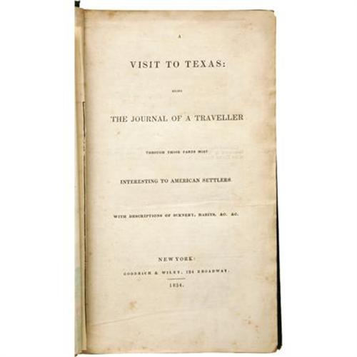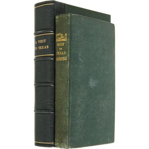 <B>M. Fiske (attributed): </B></I><B><I>A Visit to Texas: Being the Journal of a Traveller Through those Parts most Interesting to American Settlers</B></I></B></I> <B><I>with Descriptions of Scenery, Habits, &c. &c. </B></I></B></I>(New York: Goodrich & Wiley, 1834). First edition. Twelvemo (7.5" x 4.5"). iv, [9]-264 [4, Meteorological Journal] pages. Illustrated with four copper-engraved plates by J.T. Hammond. Folding map:<I> Map of the State of Coahuila and Texas</B></I>, W. Hooker, sculp. With original extensive shading and outlining in color. Original brown textured cloth, lettered and decorated in gilt on the spine. Spine slightly faded, light rubbing, mild occasional foxing, else a very good copy. Housed in a quarter morocco clamshell case, lettered in gilt on the spine. <I>From the collection of Darrel Brown.</B></I><BR><BR><B>Reference:</B></I> Streeter <I>Texas</B></I> 1155.<BR><BR><b>Shipping:</b> Books & Catalogs (<a target="_blank" href="http://www.heritageauctions.com/common/shipping.php">view shipping information</a>)