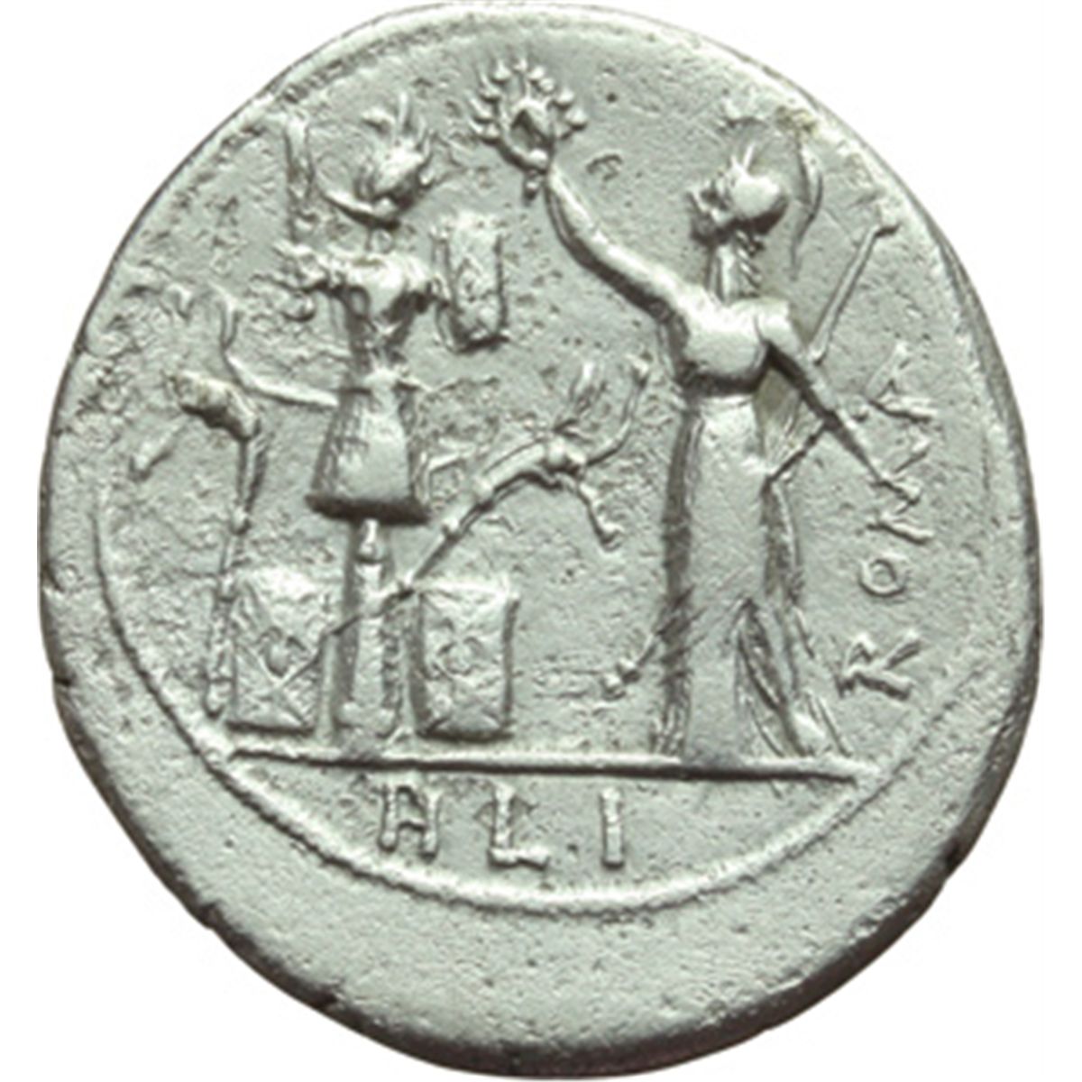 Repubblica Romana. M. Furius L. f. Philus. Denario, 119 a.C. D/ M. FOVRI. L.F. Testa laureata di Giano. R/ Roma stante a sinistra erige un trofeo. A destra, ROMA. In esergo: PHLI. Cr.281/1. B.18. AG. g. 3.76 mm. 22.00 Di qualitv† eccellente per il tipo e di modulo straordinario. qSPL.