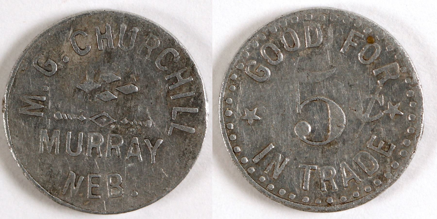 Obv.: M.G. Churchill / Murray / Neb.; Rev.: Good For / 5c / In Trade. Al., rd., 18 mm. Rare, unlisted at tokencatalog.com. State: Nebraska City: Murray Date: ID# 79400
