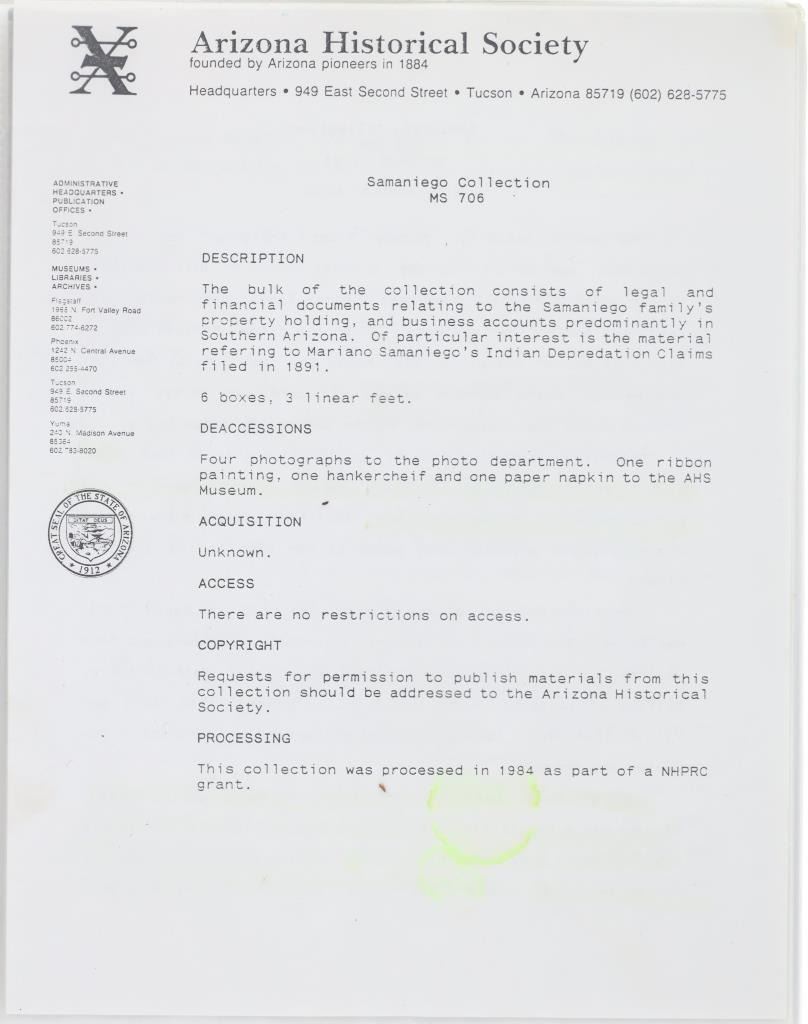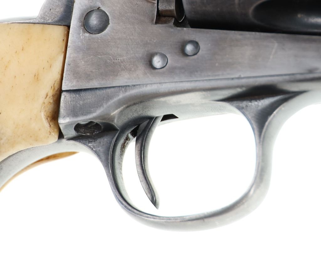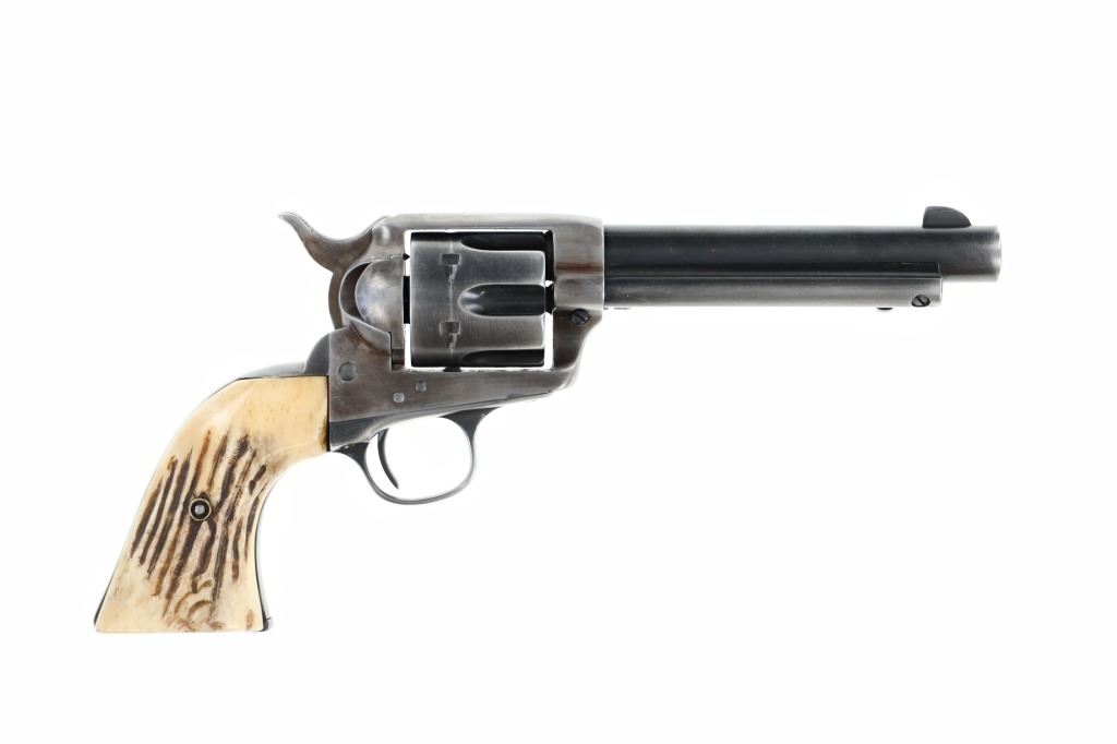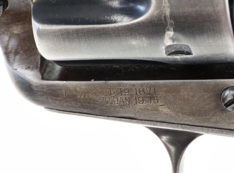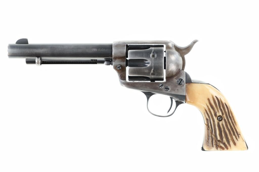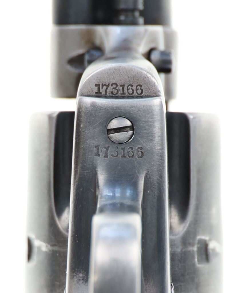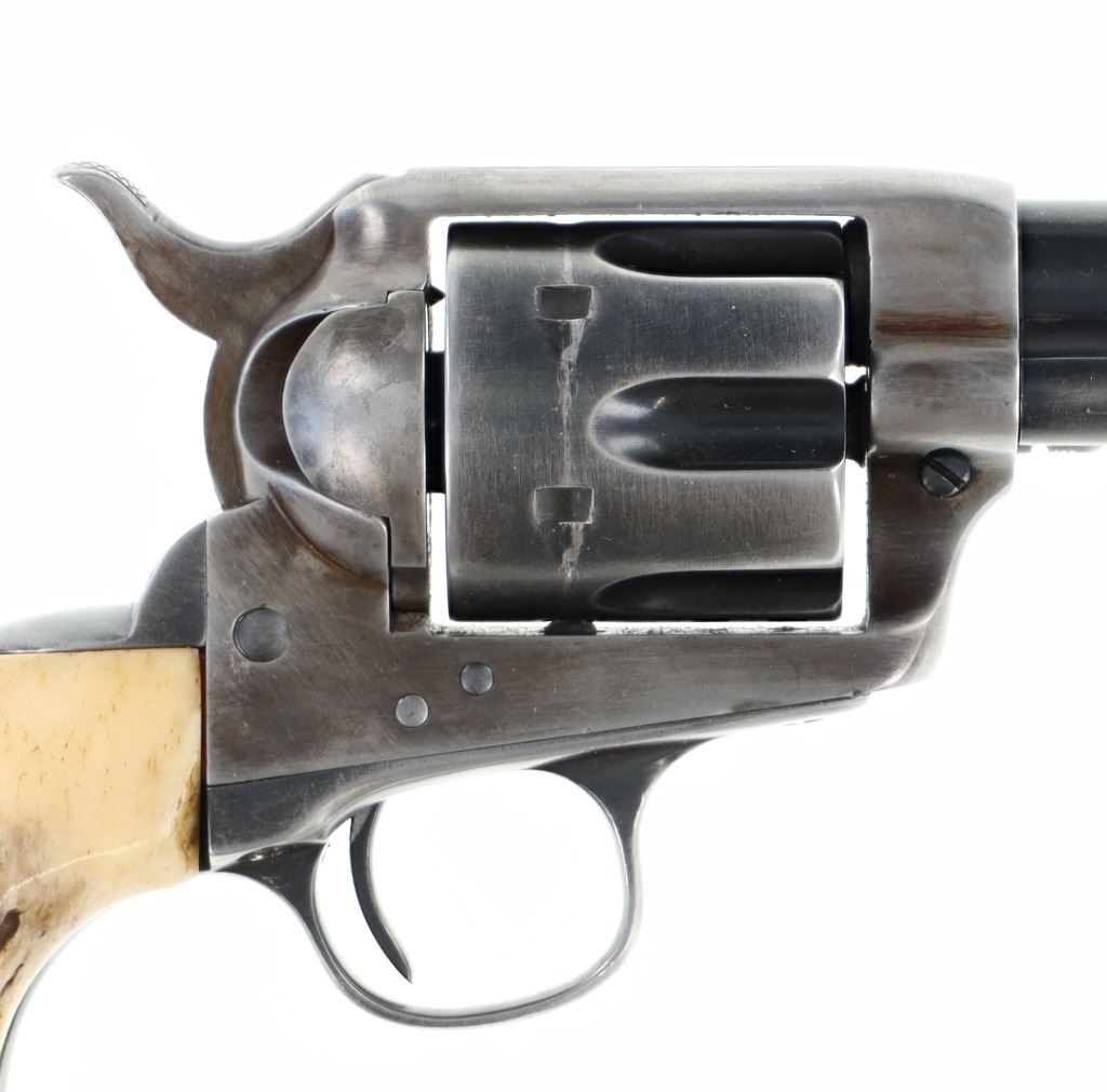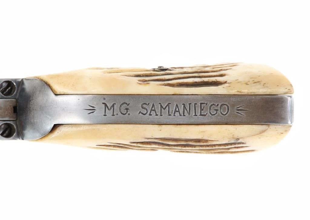 This is an original Colt Single Action Army revolver serial number 173166 manufactured in 1897 from the personal collection of Mariano G. Samaniego, as inscribed on the backstrap. Mariano G. Samaniego was a pioneer Tucson freighter, rancher and legislator who was born in Bapispe, Sonora, Mexico on July 26, 1844. Descendant from a prominent Sonoran family he moved to La Mesilla, New Mexico with his mother Ysabel upon his father Bartolo’s death where he became a naturalized United States citizen under treaty terms of the Gadsden purchase (1853). He served as an interpreter for the Confederates and the Texas Rangers during the U.S. Civil War and later became a freighter in 1864. He had a reputation as a fearless Indian-fighter noting as being attacked by the Apache Indians near Las Cruces, New Mexico in April 1868 and September 1868 having loses of $11,000 of stock, wagons and supplies for which he filed Indian Depredation Claims against the U.S. gov’t in 1891. He moved to Tucson in 1869 and operated a stage line between Tucson and Oro Blanco as well as holding several delivery contacts. His brother Bartolo was killed by Indians in Cedar Springs, Arizona while freighting for Samaniego. Samaniego was a true pioneer of Tucson, Arizona. He owned the land that furnished Tucson’s first water supply and he invested in the Rillito and Santa Cruz Valley Canal & Irrigation Company. He was appointed a regent of the University of Arizona in 1886. He represented Pima County in the 9th, 11th, and 18th Territorial Legislatures (1877, 1881, 1891, 1895) and was the county’s first assessor in 1886, as well as being elected to the Tucson City Council in 1891. Samaniego died on January 23, 1921 a true pinnacle in the development of Tucson, Arizona. This piece is inscribed / engraved on the backstrap, “M.G. SAMANIEGO” and was from his personal collection. The revolver is a Colt Single Action Army Model 1873 chambered in .38 Colt caliber with a 5.5” round barrel marked with a single address line on top, “COLT’S PT. F.A. MANF. CO. HARTFORD CT. U.S.A.” and on the side “38 COLT”. The frame is marked with the correct patent info and the gun has all matching “173166” serial numbers on the frame, trigger guard, and butt. The revolver appears to function and has the original bone stag grips attached *small old repair on the left side). Nice original condition. Comes with a binder on Samaniego’s history. Truly a rare piece of Arizona History. Antique firearm NO FFL.