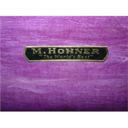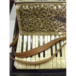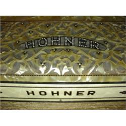 M. Hohner accordion with case. Decorative mother of pearl keys and ornate reticulated decoration on body. Case: 21" W, 17.75" D