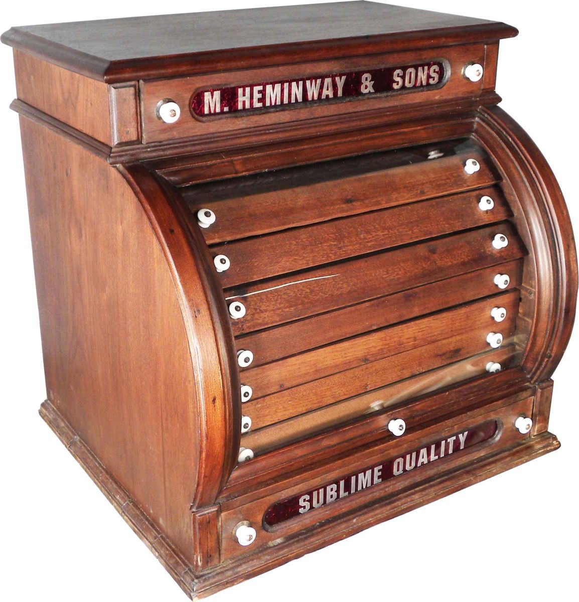 M. Heminway & Sons Spool Cabinet. Rare and Unique cash register style, mahogany with ruby glass inserts. Excellent condition. 22 X 21 X 17 1/2 inches.
