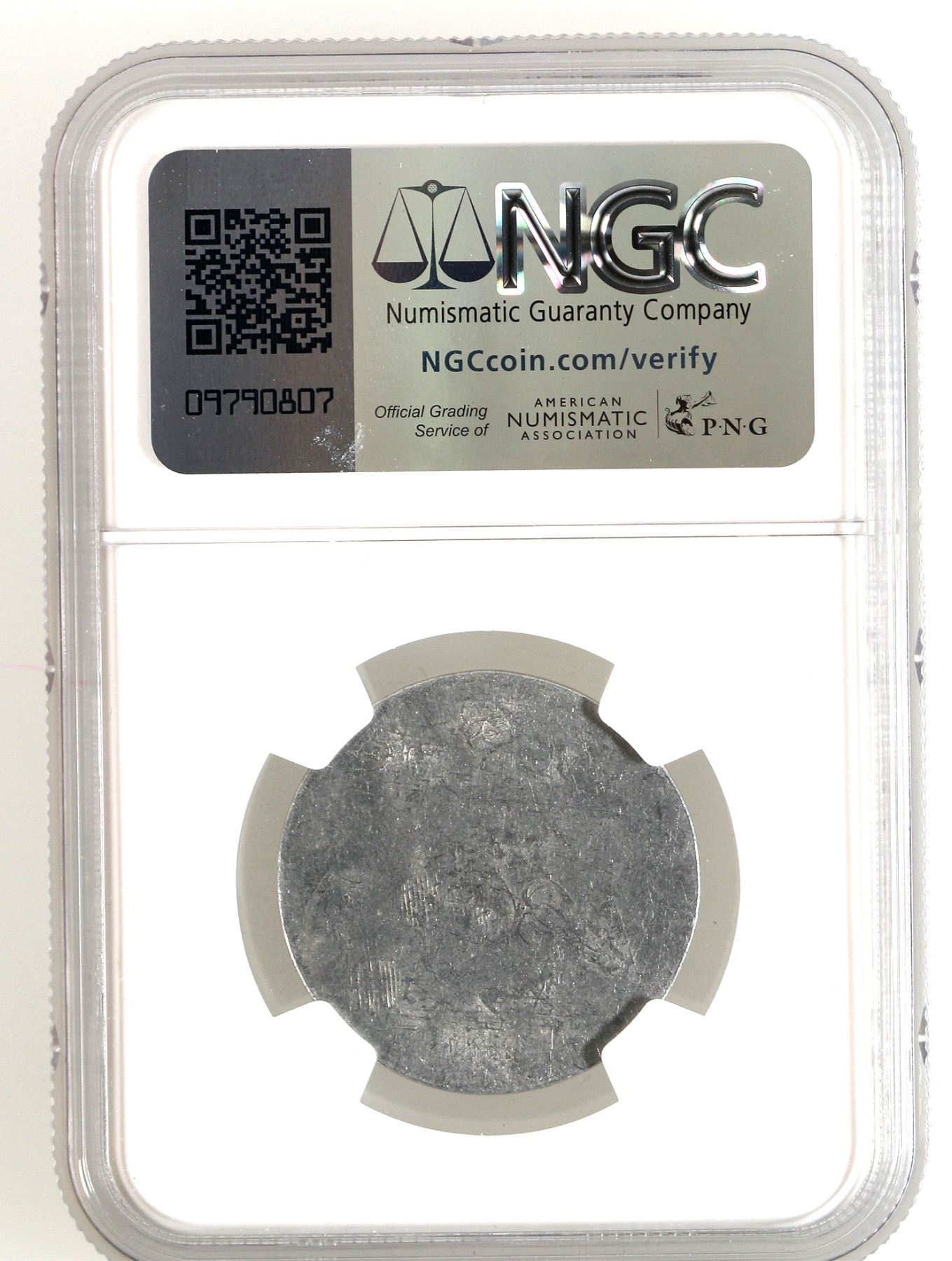 Finest known: NGC graded MS 64. M.I.N.R.A. / 10c / IN TRADE (all incuse) // (blank); Al., rd., 29 mm.
