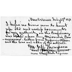 <b>734. M. JEFF THOMPSON</b> (1826 - 1876) Confederate raider who commanded a brigade in Missouri and threatened to retake New Orleans from Union forces. Fine A.Q.S. on a 24mo. card, New Orleans, July 27, 1874, in full: "<i>I have no time now to hunt up old and useless documents for my authority on the Confederacy was based upon my Missouri Commission, letters from Superior officers and the love and valor of the soldiers. M. Jeff Thompson once Brigadier General now Chief State Engineer</i>". A few tiny rust spots from an old paperclip have virtually no effect, else very good.<b> $300-400</b>
