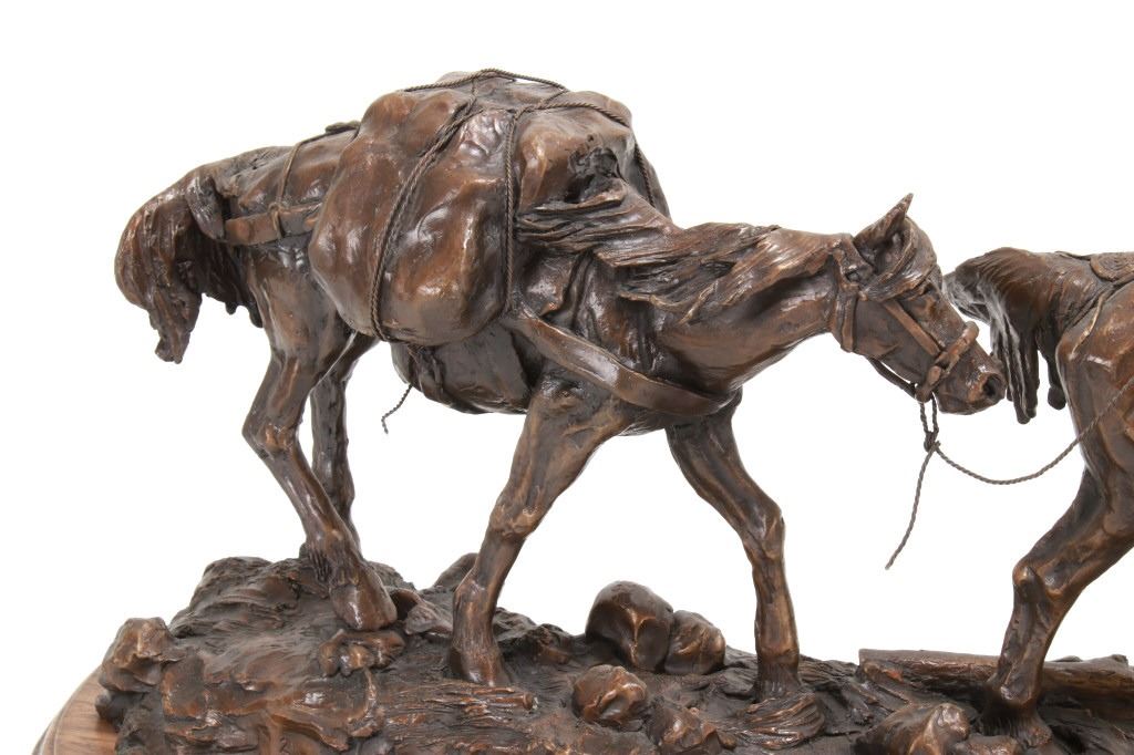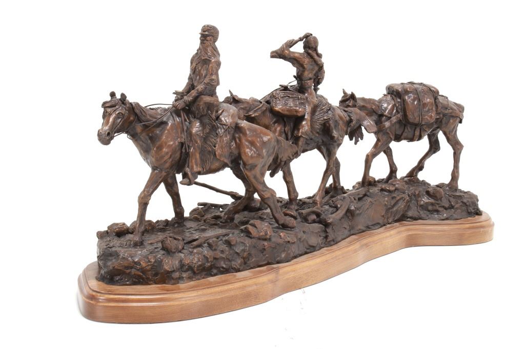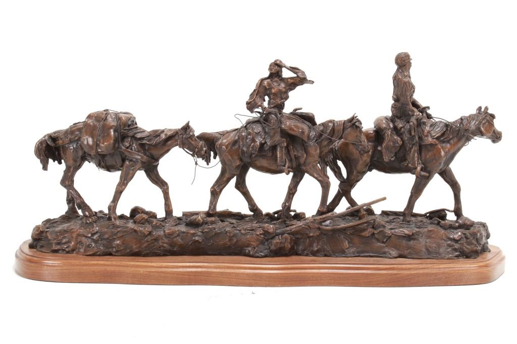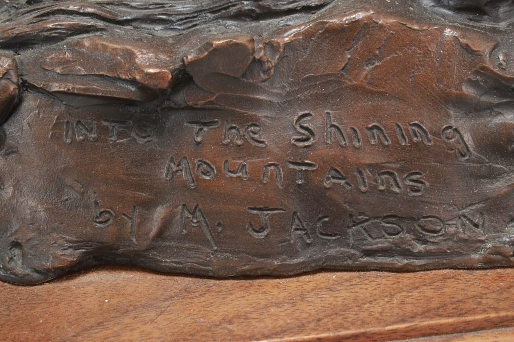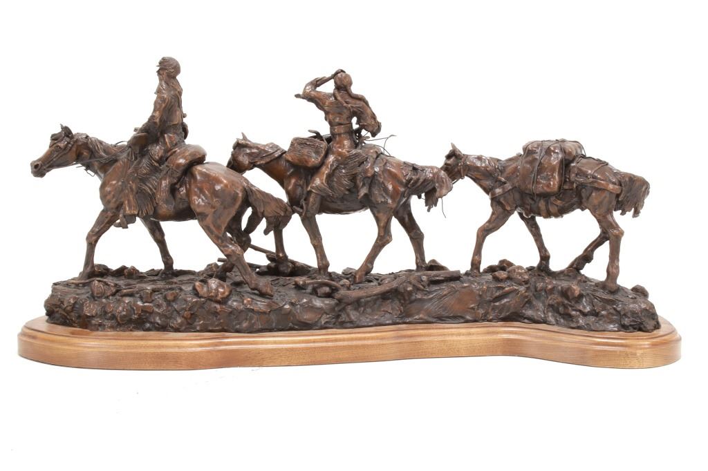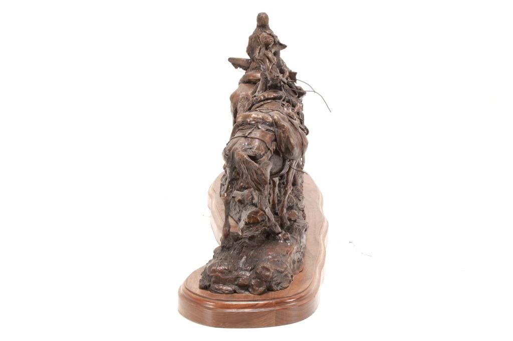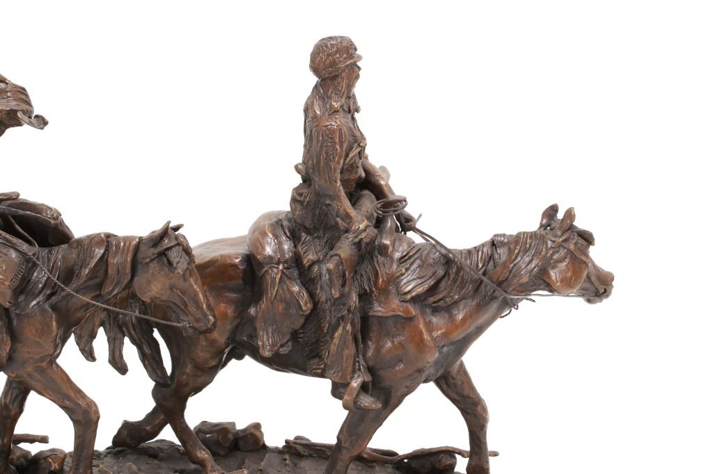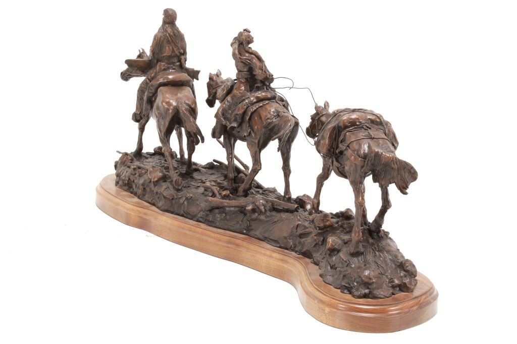 Featured in this lot is this huge bronze, numbered 2/10, called "Into the Shining Mountains" from artist Margie Jackson (born 1934 and passed 2021). This is one of the largest bronzes to come through this auction house. This bronze, although numbered 2/10, is the last of this mold, made before the mold broke, so it was actually the last to be made. The piece was awarded the Judges Award Certificate for "Excellent Execution in Sculpture" from Fred Oldfield of Western Heritage and Art Center on April 9, 2016. It portrays a beautiful scene of a mountain man leading the way with a woman mounted on a horse behind him, trailing with the pack horse. The artist’s signature and title can be seen on the side of the bronze underneath the mountain man and his horse; the number is on the side of the bronze underneath the woman and the pack horse. Margie Jackson (1934-2021) was a painter for years before she became a sculptor. Her experience at casting her creations in bronze began around 1976. Jackson lived on a farm in Yelm, Washington, but she grew up in Texas and Oklahoma. Because the range was open and cattle left on their own, they would be prey to packs of wolves and coyotes. Horses were still respected as a means of transportation and the area was plentiful with Native Americans still richly steeped in their own culture, lending to the inspiration of her work. Among her numerous awards are Best of Show-Sculpture at the Celebration of Western Art Show in Olympia, Washington and First and Second places at the 1986 and 1987 Arizona Annual Art Shows. She was commissioned to create bronze and limited-edition prints celebrating the Washington State Centennial; the city of Yelm purchased one of these pieces for installation in the City Hall. The condition of this bronze is good, with no obvious signs of damage. The measurements of this bronze are 10" x 40" x 18 1/2". Provenance: This is from the personal Artist Margie Jackson. The bronze likely would have been priced at $15,000-$25,000 in a gallery.