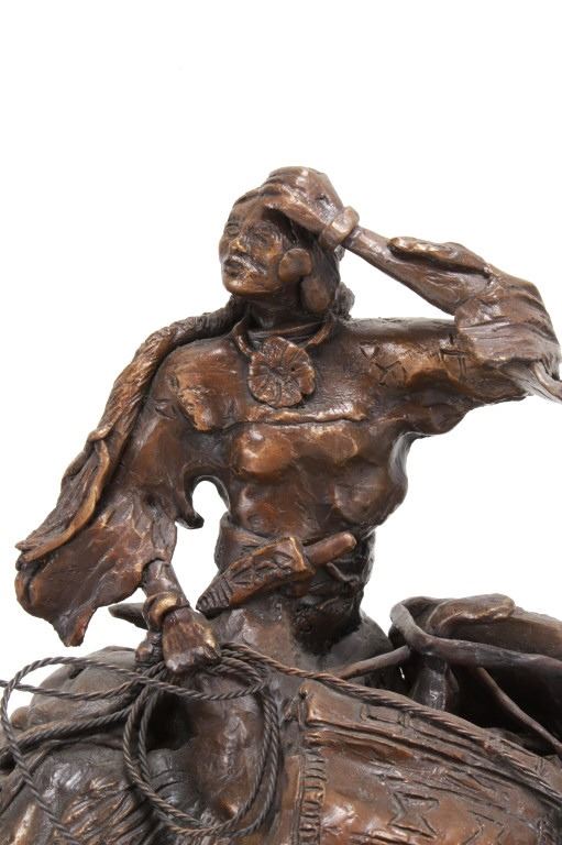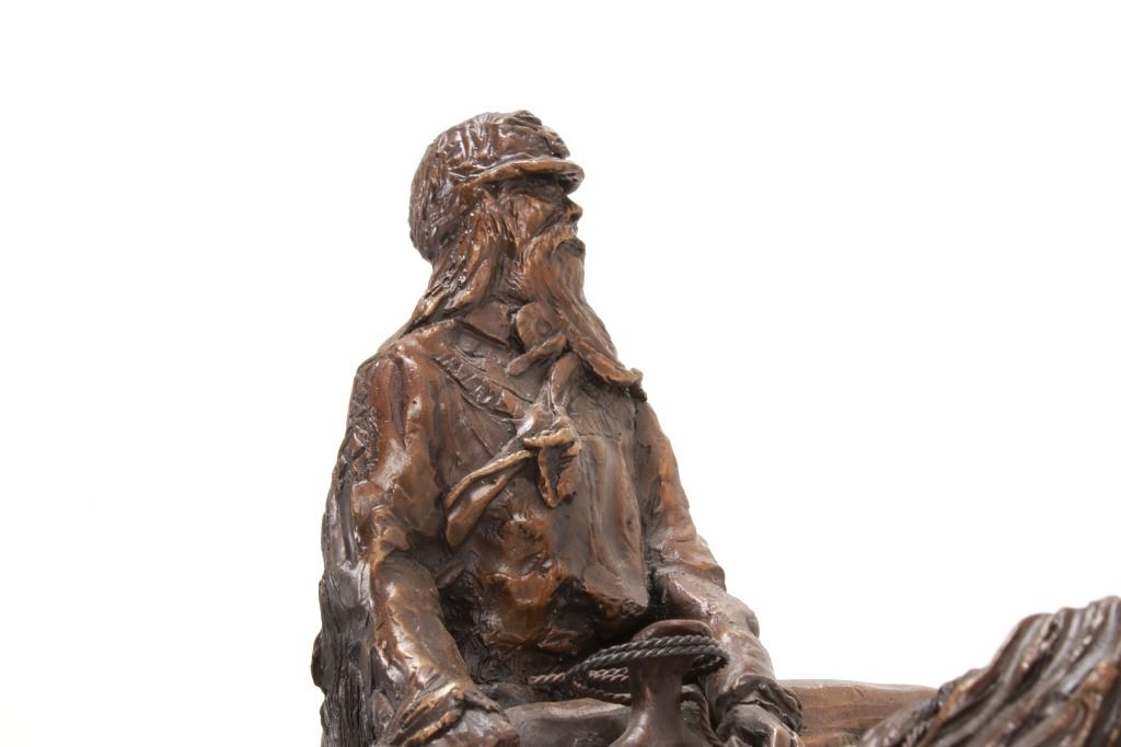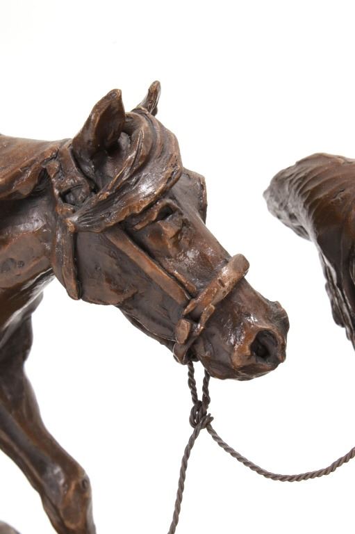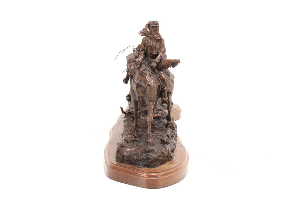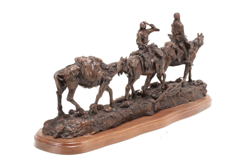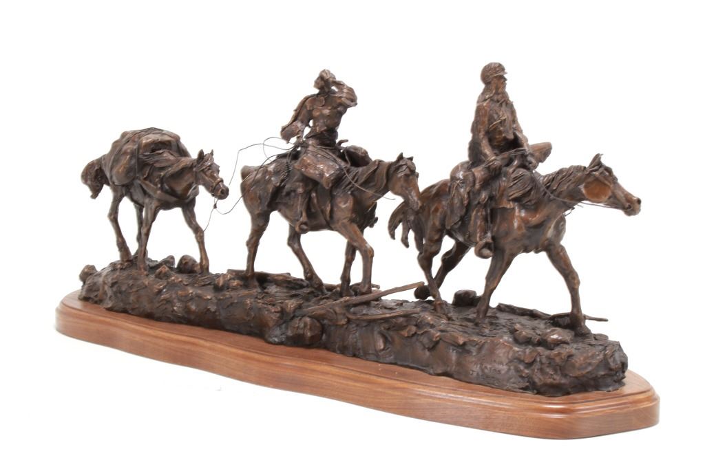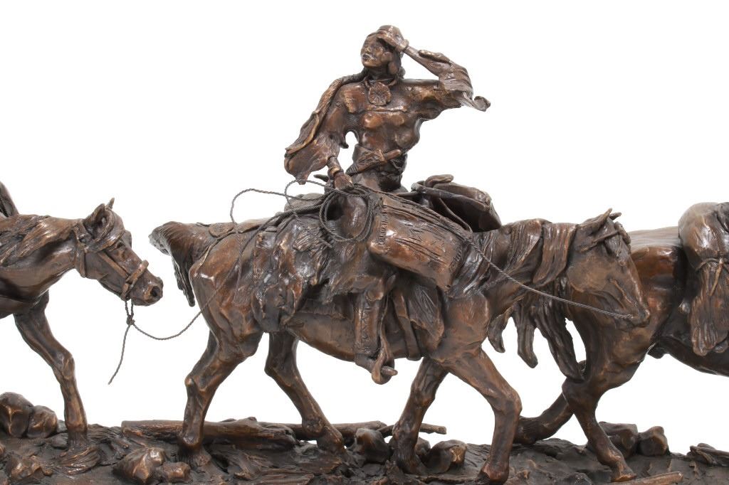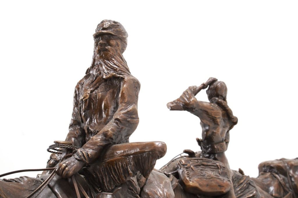 Featured in this lot is this huge bronze, numbered 2/10, called "Into the Shining Mountains" from artist Margie Jackson (born 1934 and passed 2021). This is one of the largest bronzes to come through this auction house. This bronze, although numbered 2/10, is the last of this mold, made before the mold broke, so it was actually the last to be made. The piece was awarded the Judges Award Certificate for "Excellent Execution in Sculpture" from Fred Oldfield of Western Heritage and Art Center on April 9, 2016. It portrays a beautiful scene of a mountain man leading the way with a woman mounted on a horse behind him, trailing with the pack horse. The artist’s signature and title can be seen on the side of the bronze underneath the mountain man and his horse; the number is on the side of the bronze underneath the woman and the pack horse. Margie Jackson (1934-2021) was a painter for years before she became a sculptor. Her experience at casting her creations in bronze began around 1976. Jackson lived on a farm in Yelm, Washington, but she grew up in Texas and Oklahoma. Because the range was open and cattle left on their own, they would be prey to packs of wolves and coyotes. Horses were still respected as a means of transportation and the area was plentiful with Native Americans still richly steeped in their own culture, lending to the inspiration of her work. Among her numerous awards are Best of Show-Sculpture at the Celebration of Western Art Show in Olympia, Washington and First and Second places at the 1986 and 1987 Arizona Annual Art Shows. She was commissioned to create bronze and limited-edition prints celebrating the Washington State Centennial; the city of Yelm purchased one of these pieces for installation in the City Hall. The condition of this bronze is good, with no obvious signs of damage. The measurements of this bronze are 10" x 40" x 18 1/2". Provenance: This is from the personal Artist Margie Jackson. The bronze likely would have been priced at $15,000-$25,000 in a gallery.