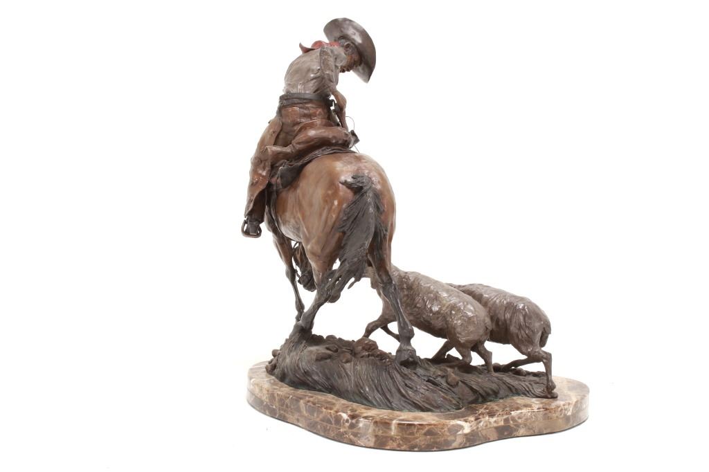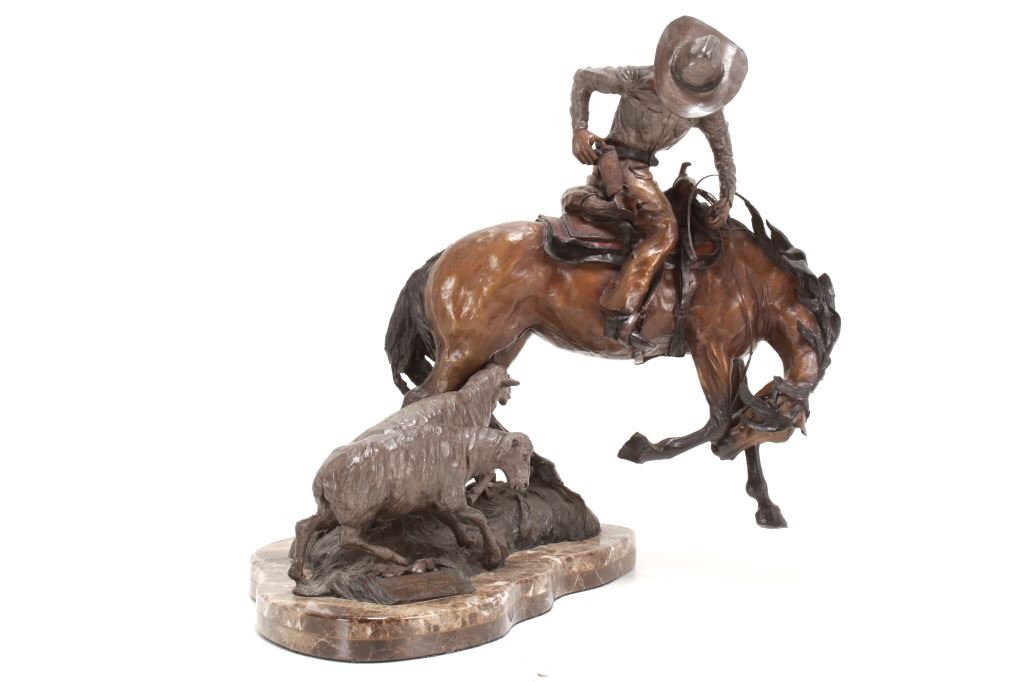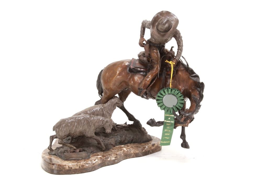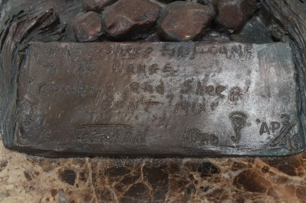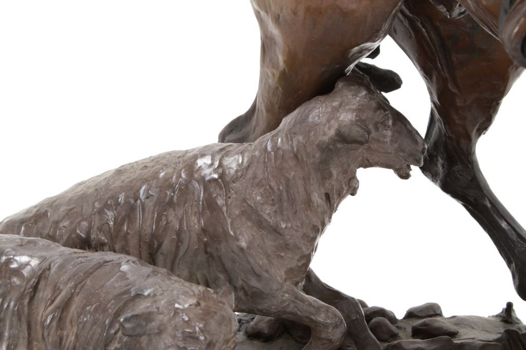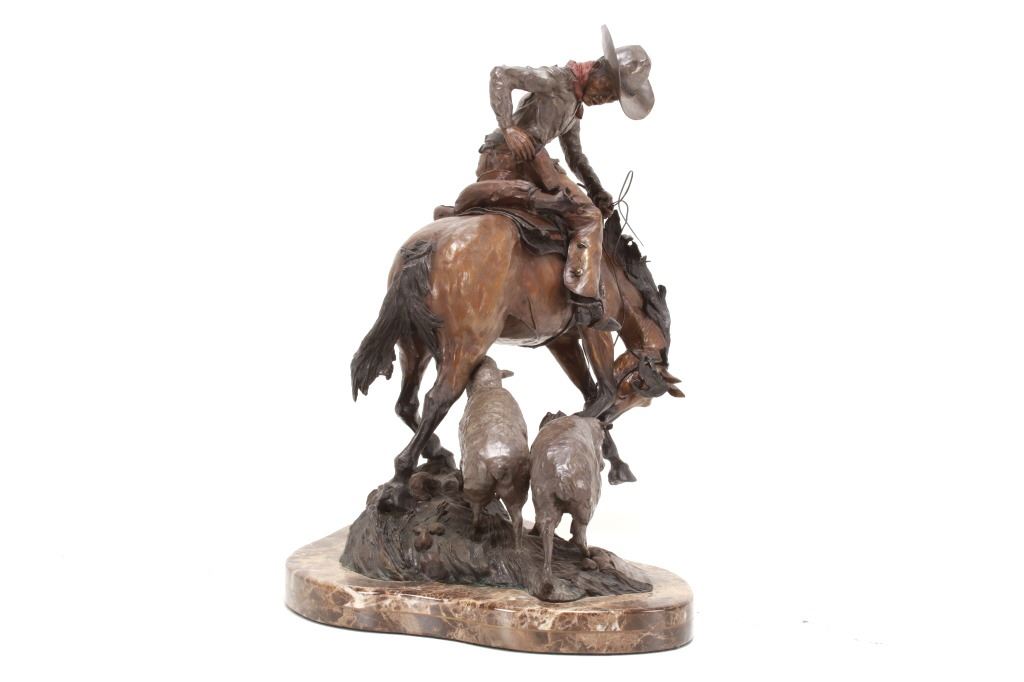 Featured in this lot is this 1986 artist proof bronze called "When Sheep are First Came to the Range - Cowboys and Sheep don't Mix!" by Margie Jackson (born 1934 and passed in 2021). This piece won the "Best of Show" award for the celebration of Western Art sculpture class in 2010. This is a fantastic piece that really comes alive with a scene of sheep gravitating underneath a cowboy’s horse, which spooks the horse, causing it to bolt from the sheep. The artist’s signature can be seen with the title and the date just underneath the second sheep, mounted on a marble shield. Margie Jackson (1934-2021) was a painter for years before she became a sculptor. Her experience at casting her creations in bronze began around 1976. Jackson lived on a farm in Yelm, Washington, although she grew up in Texas and Oklahoma. Because the range was open and cattle left on their own, they would be prey to packs of wolves and coyotes. Horses were still respected as a means of transportation and the area was plentiful with Native Americans still richly steeped in their own culture, lending to the inspiration of her work. Among her numerous awards are Best of Show-Sculpture at the Celebration of Western Art Show in Olympia, Washington and First and Second places at the 1986 and 1987 Arizona Annual Art Shows. She was commissioned to create bronze and limited-edition prints celebrating the Washington State Centennial; the city of Yelm purchased one of these pieces for installation in the City Hall. The condition of this large bronze is good, with no obvious signs of damage. The measurements of this bronze are 15" x 23" x 23". Provenance: This is from the personal Artist Margie Jackson.