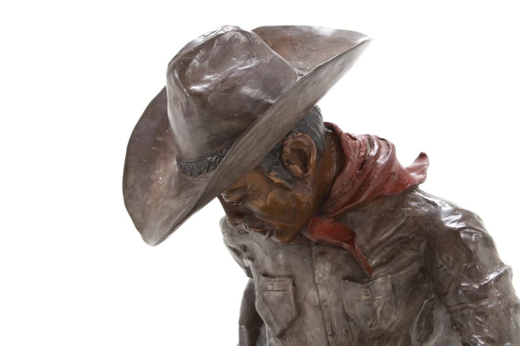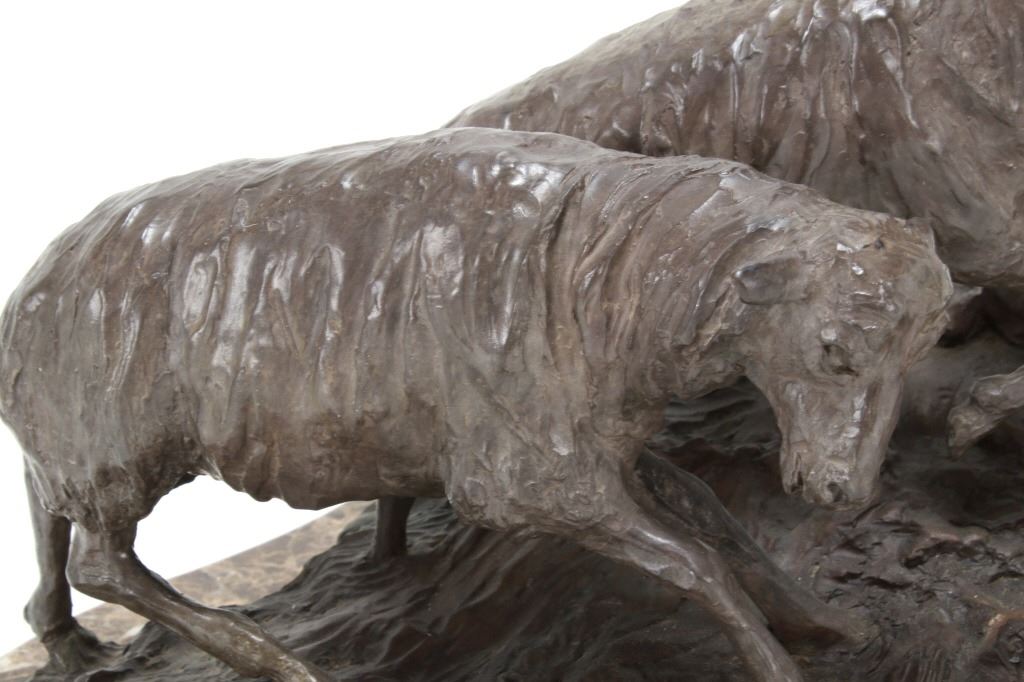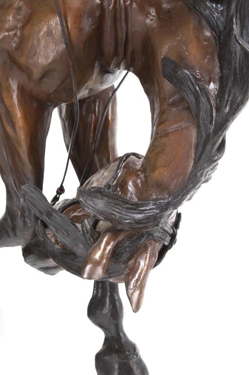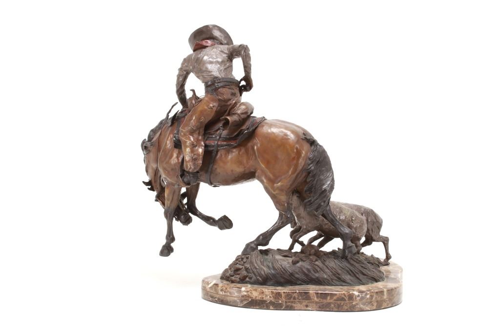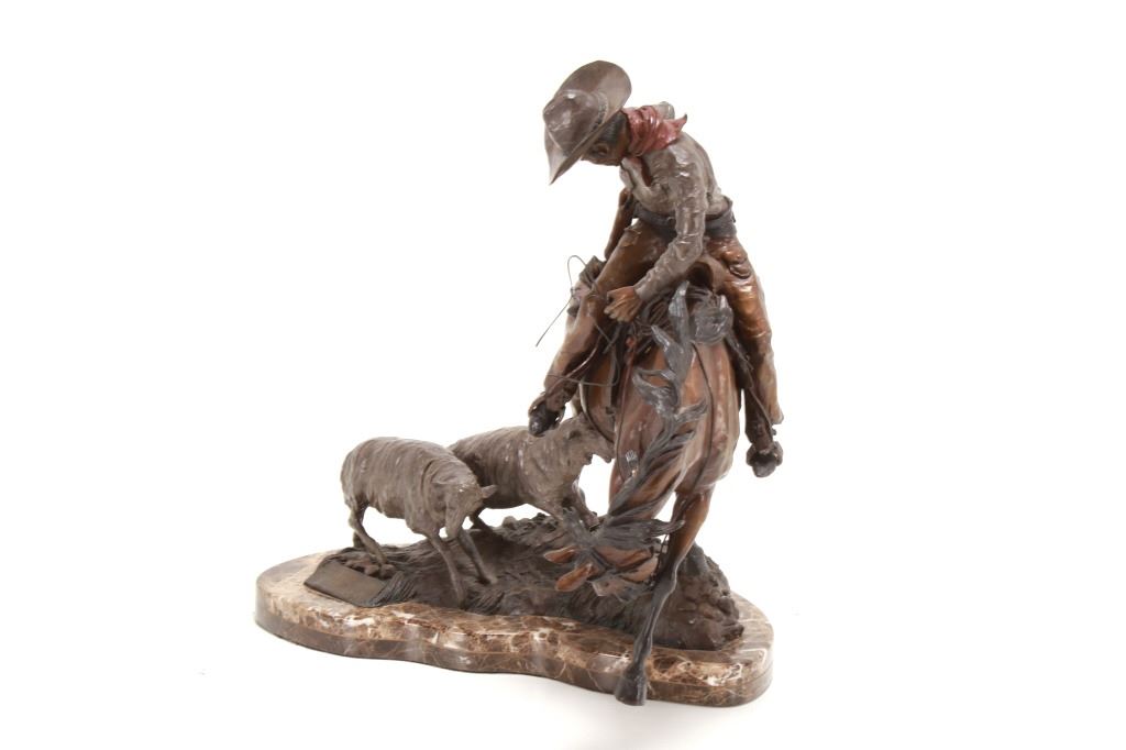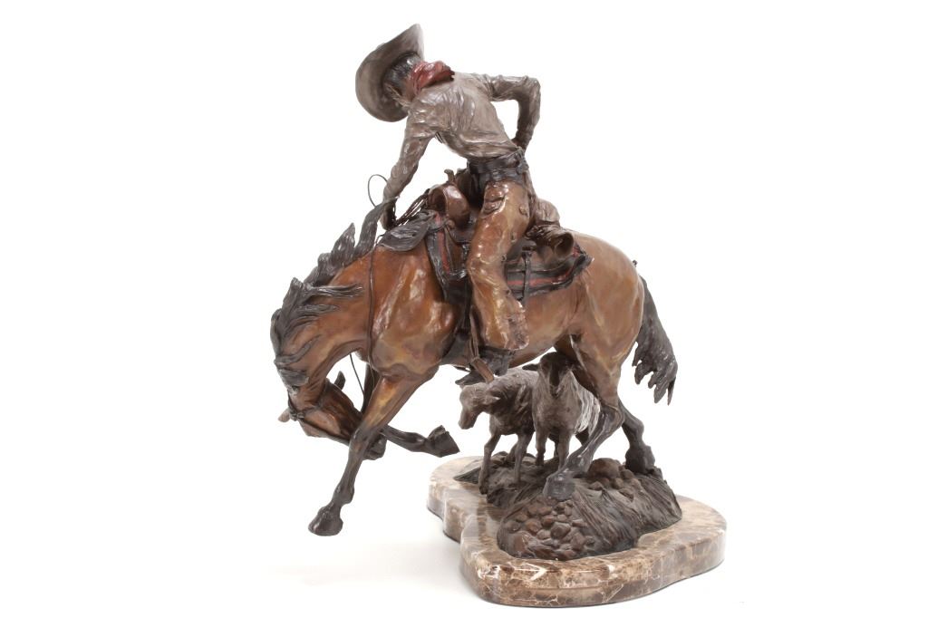 Featured in this lot is this 1986 artist proof bronze called "When Sheep are First Came to the Range - Cowboys and Sheep don't Mix!" by Margie Jackson (born 1934 and passed in 2021). This piece won the "Best of Show" award for the celebration of Western Art sculpture class in 2010. This is a fantastic piece that really comes alive with a scene of sheep gravitating underneath a cowboy’s horse, which spooks the horse, causing it to bolt from the sheep. The artist’s signature can be seen with the title and the date just underneath the second sheep, mounted on a marble shield. Margie Jackson (1934-2021) was a painter for years before she became a sculptor. Her experience at casting her creations in bronze began around 1976. Jackson lived on a farm in Yelm, Washington, although she grew up in Texas and Oklahoma. Because the range was open and cattle left on their own, they would be prey to packs of wolves and coyotes. Horses were still respected as a means of transportation and the area was plentiful with Native Americans still richly steeped in their own culture, lending to the inspiration of her work. Among her numerous awards are Best of Show-Sculpture at the Celebration of Western Art Show in Olympia, Washington and First and Second places at the 1986 and 1987 Arizona Annual Art Shows. She was commissioned to create bronze and limited-edition prints celebrating the Washington State Centennial; the city of Yelm purchased one of these pieces for installation in the City Hall. The condition of this large bronze is good, with no obvious signs of damage. The measurements of this bronze are 15" x 23" x 23". Provenance: This is from the personal Artist Margie Jackson.