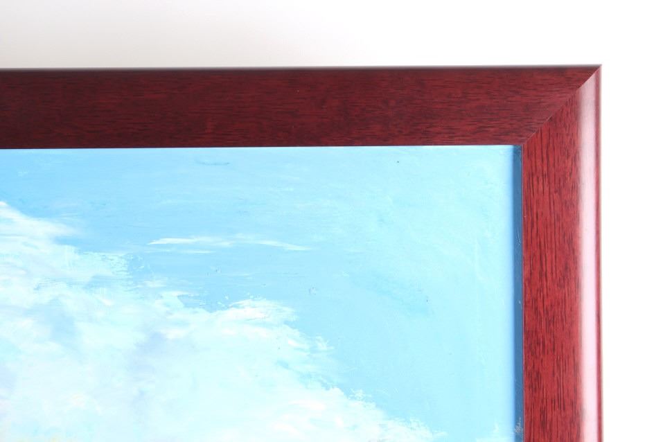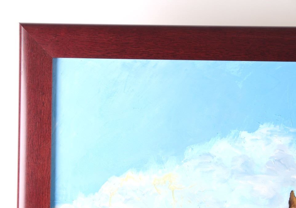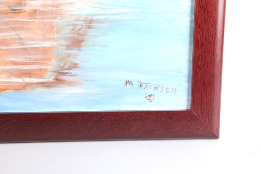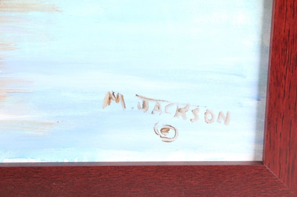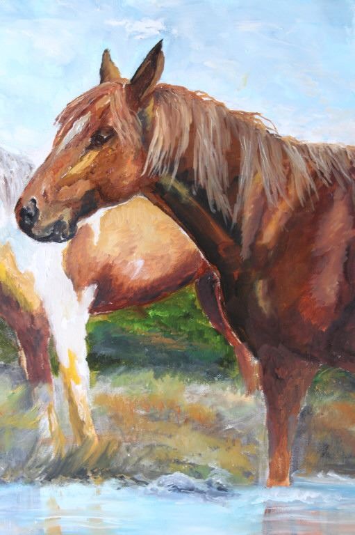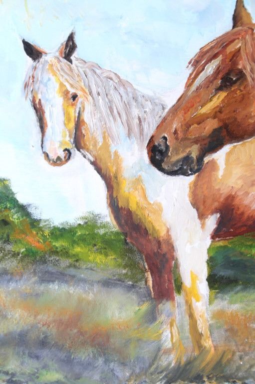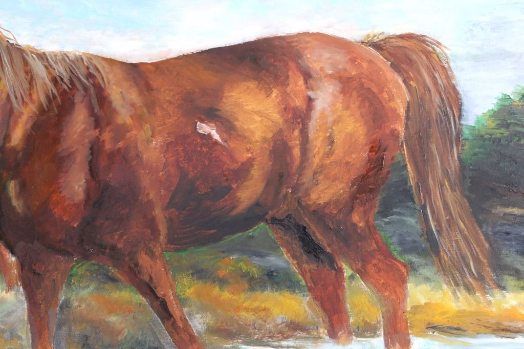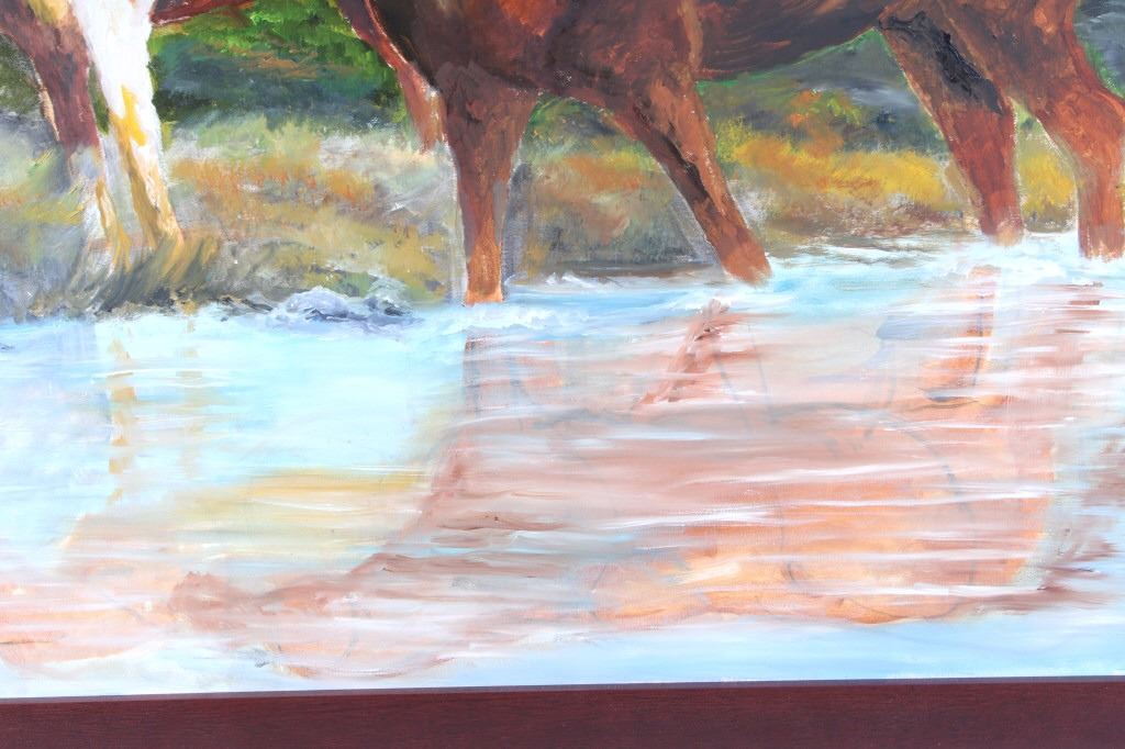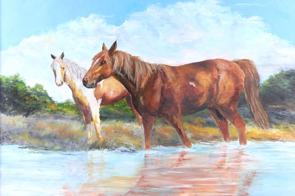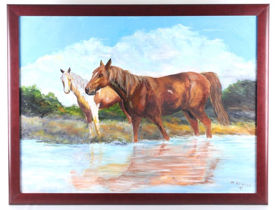 Featured in this lot is this oil painting on canvas of two horses creek side from artist Margie Jackson born 1934 and died 2021. The artwork shows two horses creek side with a wooded scene in the background and under a clear sky with some clouds in the distance. Margie Jackson (1934-2021) was a painter for years before she became a sculptor. Her experience at casting her creations in bronze began around 1976. Jackson lived on a farm in Yelm, Washington, but grew up in Texas and Oklahoma. Because the range was open and cattle left on their own, they would be prey to packs of wolves and coyotes. Horses were still respected as a means of transportation and the area was plentiful with Native Americans still richly steeped in their own culture, lending to the inspiration of her work. Among her numerous awards are Best of Show-Sculpture at the Celebration of Western Art Show in Olympia, Washington and First and Second places at the 1986 and 1987 Arizona Annual Art Shows. She was commissioned to create bronze and limited-edition prints celebrating the Washington State Centennial; the city of Yelm purchased one of these pieces for installation in the City Hall. The condition of this framed oil on canvas painting is good with no obvious signs of damage and in good overall display condition. The measurements of this painting are 33 1/2" x 43 1/2" and the visible art measures 29 1/2" x 39 1/2".