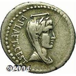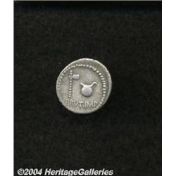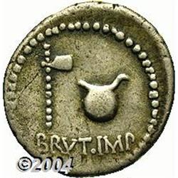 <B>M. Junius Brutus.</B></I> 42 B.C. AR denarius (18 mm, 3.58 g). Mobile military mint with Brutus in western Asia Minor. Laureate, draped and veiled bust of Ceres right, wearing polos / Axe and a simpulum. Crawford 508/2; HCRI 214; Sydenham 1300; RSC 2. Toned, VF, old obverse scratch. Very rare. <BR><BR><B>Important notice:</B> Heritage usually auctions material at the rate of 200-250 lots per hour. On some occasions eBay Live bid software or the Internet may not be able to keep up with the pace of the auction. We recommend placing a realistic absentee bid now as insurance to avoid disappointment. Occasionally the auctioneer may eliminate or reject an eBay Live bid, and the auctioneer may also reopen a lot after the close of the eBay live bidding (usually because we missed an audience bid), and may reject your bid even if it shows you as the winning bidder. By bidding via eBay Live, you agree that Heritage may award the lot to another bidder at its sole discretion under the circumstances described above or any other reasonable circumstances. Since eBay bids are not shown to us until we open the lot on the floor, we treat those bids just like floor bids. In most cases the floor responds before the eBay bid is presented to us, due to Internet lag time, so for consistency we have made it a policy that floor bids are always considered first over tie eBay live bids. Also please note that all Heritage lots purchased through eBay Live carry a 20% Buyer's Premium. Please make sure you read the Terms and Conditions before you bid.