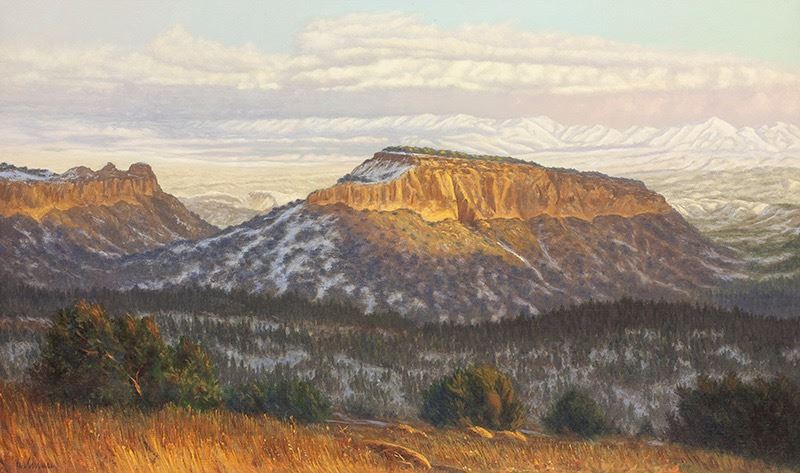 To the unaided eye, this piece appears to be in very good condition. Inspection under ultraviolet light shows normal fluorescence of the artist's pigments. This piece is in a rustic wooden frame with a burlap liner and an antiqued gold fillet. The frame is in good condition, displaying normal signs of wear. Verso: (handwritten) Los Alamos Mesas © M. L. Coleman 1978 Reproduction Rights Reserved # 78-6 Damar Varnish 6/78