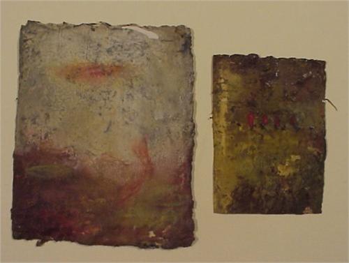M’Liz Keefe (20th Century) American (two) UNTITLED, 1994, pair of oil paintings on tarpaper, 9 3/4 x 8" & 7 x 5", one signed and dated, smaller one with staples protruding from verso. (2)