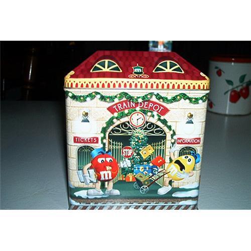 Featuring an M & M's Limited Edition Train Depot Tin. M & M's Brand Christmas Village Series, Train Depot; Number 13-Limited Edition Canister, 2001. Distributed by M&M-Mars Division of Mars, Inc. Hacketts Town, N.J. Beautifully decorated tin train depot. Excellent condition. Gold tone on the inside.