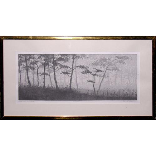 An interesting and attractive vintage slate proof lithograph by artist Merrill Mason entitled, 'FOREST'. The piece, depicting a forest in the mist, is done in a beautiful color palette of emotionally evocative shades of gray. It is signed by the artist in pencil at the lower left, 'Slate Proof - 3rd Slate', and in the lower center, 'Forest'; at the lower right, 'Merrill Mason '77'. On the reverse, the artist has written in ink, 'Merrill Mason Windabout Drive Greenwich, CT. 06830'. Matted in off-white, this piece is framed in thin gilded wood which has some rubbing and scratches due to age. The lithograph itself is under glass and in excellent condition, with dimensions of 19.25" high by 36" wide.