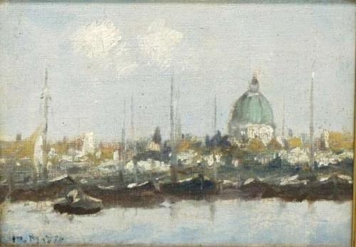 M. MAYIS - Turn of the 20th century Central European school. A pair of oil paintings on canvas panel. Each depicting a harbour scene with church steeples in the background. Each signed lower left, 4 3/4" x 6 3/4". In gilt frame. 1400-1800