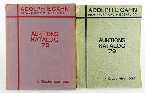 Cahn, Adolph E. DAS FÜRSTLICH FÜRSTENBERGISCHE MÜNZKABINETT ZU DONAUESCHINGEN. TEIL IV: DIE SERIEN DER SCHWEIZ UND DES ELSASS. EINE SAMMLUNG MITTELALTERMÜNZEN AUS DEUTSCHEM PRIVATBESITZ. Frankfurt am Main, 15. September 1932 und folgende Tage. 4to, original printed card covers. (8), 99, (1) pages; 1871 + 6 lots; 18 fine plates; valuation list. Very good or better. [with] Cahn, Adolph E. DAS FÜRSTLICH FÜRSTENBERGISCHE MÜNZKABINETT ZU DONAUESCHINGEN. TEIL VII: DIE MÜNZEN VON LOTHRINGEN, DER FRANZÖSISCH FEODALEN, DER MEROWINGER UND KAROLINGER SOWIE DER FRANZÖSISCH KÖNIGE BIS INCLUSIVE FRANZ I. ZUMEIST AUS DER EHEMALIGEN SAMMLUNG F. DE SAULCY. Frankfurt am Main: Nr. 79, 14. Dezember 1932. 4to, original printed card covers. (6), 85, (3) pages; 1563 lots; 19 fine plates; valuation list. Very good. Two installments of this notable sale of medieval coins.